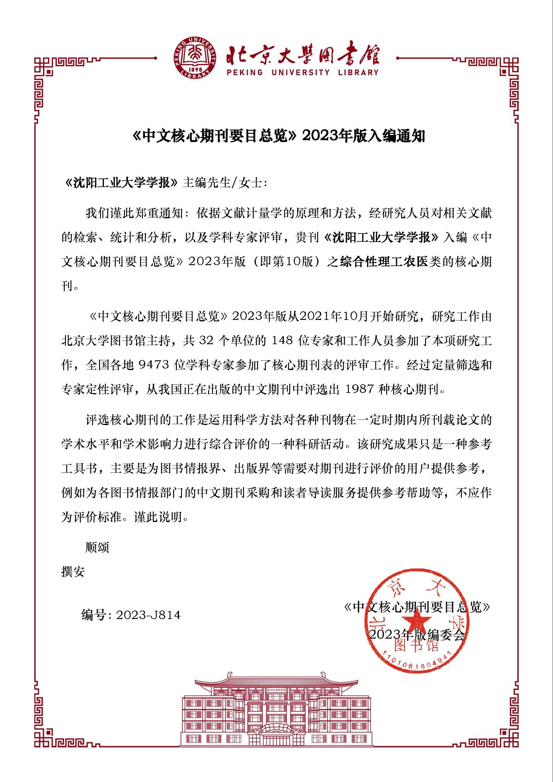 《沈陽工業(yè)大學(xué)學(xué)報》為中文核心期刊、中國科技核心期刊、RCCSE中國核心學(xué)術(shù)期刊、中國高校優(yōu)秀科技期刊、全國編校質(zhì)量優(yōu)秀期刊、遼寧省一級期刊,并被國際著名檢索系統(tǒng)荷蘭Scopus數(shù)據(jù)庫、英國INSPEC數(shù)據(jù)庫、美國《劍橋科學(xué)文摘》、美國《化學(xué)文摘》、波蘭《哥白尼索引》、俄羅斯《文摘雜志》、美國《烏利希國際期刊指南》等收錄。