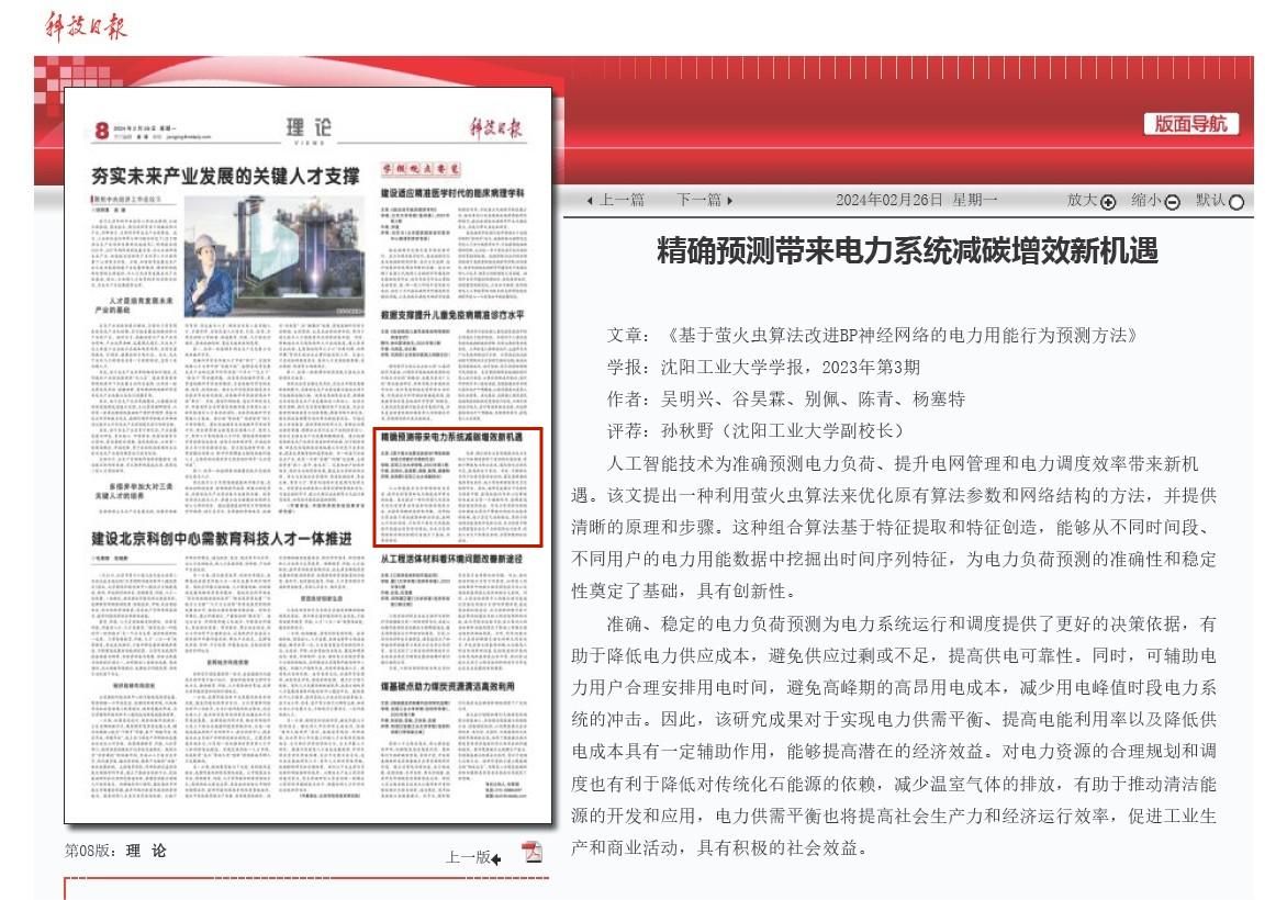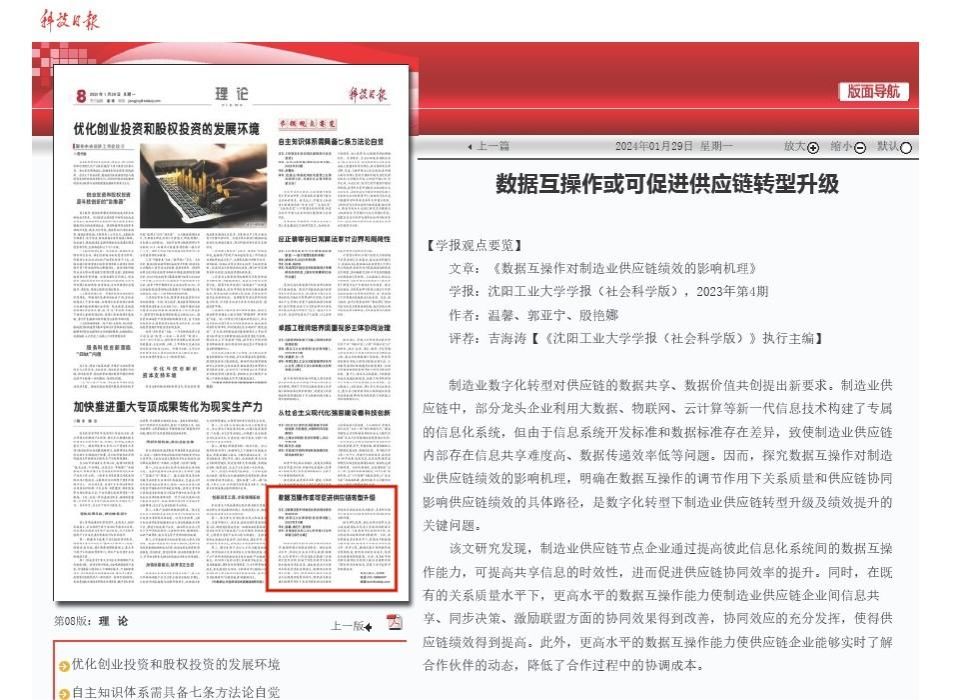 近期,《科技日報(bào)》理論版“學(xué)報(bào)觀點(diǎn)要覽”推介了兩篇我校學(xué)報(bào)刊載的論文。其中,1月29日,該欄目推介了學(xué)報(bào)(社科版)2023年第4期刊載的論文《數(shù)據(jù)互操作對制造業(yè)供應(yīng)鏈績效的影響機(jī)理》;2月26日,該欄目推介了學(xué)報(bào)自然版2023年第3期刊載的論文《基于螢火蟲算法改進(jìn)BP神經(jīng)網(wǎng)絡(luò)的電力用能行為預(yù)測方法》,另有兩篇學(xué)報(bào)稿件待刊發(fā)。