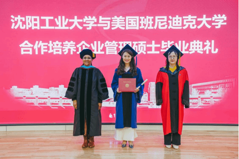 6月16日上午,沈陽工業大學與美國班尼迪克大學在中央校區科學會堂合作舉辦企業管理碩士(MBA)學位教育項目畢業典禮暨學位授予儀式。美國班尼迪克大學朱莉·多克里副教務長,沈陽工業大學黨委常委、副校長柯麗出席典禮。美國班尼迪克大學艾麗斯教授、克雷格·納坦森教授,沈陽建筑大學王星教授,管理學院、經濟學院有關負責同志,企業管理碩士項目2020-2023屆畢業生代表、2024屆79名畢業生以及2025屆在讀學生代表參加典禮。國際教育學院直屬黨支部書記兼國際合作處副處長徐巖主持典禮。