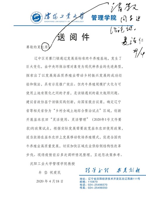 為深入研究國家提出創新開展基本農田“靈活使用,靈活管理”的要求,管理學院特聘教授牟岱和祝愛民院長從2020年初開始,多次深入我省農村基層開展調查研究活動,針對我省高品質肉牛養殖基地遼中區肖寨門鎮大力發展種養結合過程中,在鄉村全域土地綜合治理過程中形成的管理經驗和遇到的管理問題,進行了半年多的個案研究,形成了研究報告,提出了我省和國家在土地資源和產業發展管理問題上,應該根據實際發展需要放寬基本農田使用管理政策,適當鼓勵在基本農田上發展移動牧場養殖模式,推動種養結合的生態循環經濟,促進全國肉牛養殖高質量發展和種植業生態科學化發展,切實加快區域農業供給側結構改革步伐。該報告得到了遼寧省政協夏德仁主席、沈陽市市長姜有為、沈陽市副市長王廣生的重要批示,并組成省政協、環保廳、自然資源廳、省農科院、市政協等有關部門專家參加的聯合調研組,進行了調研論證,肯定了種養結合的發展方向和肖寨門鎮的可借鑒性的管理經驗,并決定將肖寨門鎮納入明年的試點,進一步通過試點確定種養結合發展涉及到的土地管理、產業管理、生態管理、科技管理和人才管理的有關政策。