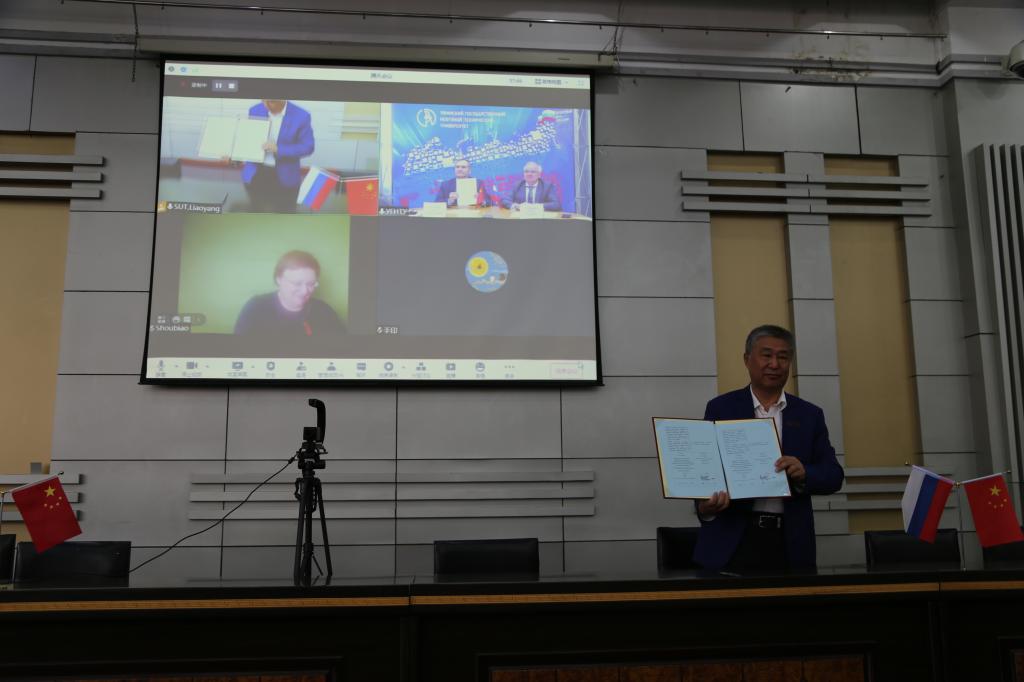 9月30日下午,中俄校際合作云簽約儀式暨石油化工領域學術交流會在沈陽工業大學遼陽分校成功舉行。黨委副書記、校長郭連軍代表我校簽署合作協議,會議由黨委常委、副校長陳延明主持。