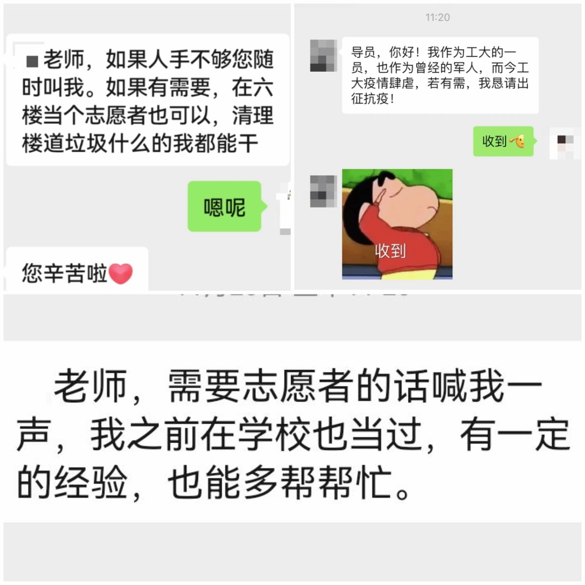 “老師,我是黨員,有需要一定叫我!”“作為工大學子,也是曾經的軍人,若有需,召必應!”“我申請當志愿者,為同學做點貢獻,為老師減輕點負擔”“我在社區做過防疫志愿者,有經驗,需要人就直接找我”……一句句,一聲聲,是青春的熱血和諾言,更是青年的責任和擔當。只要學校有需要,同學有需要,他們就義不容辭。