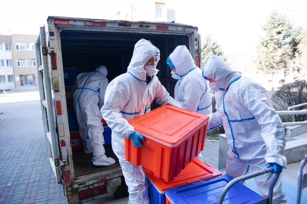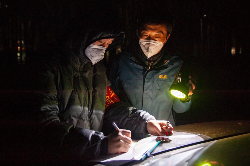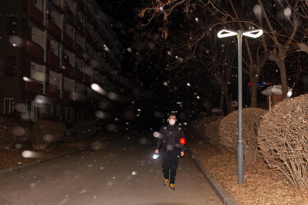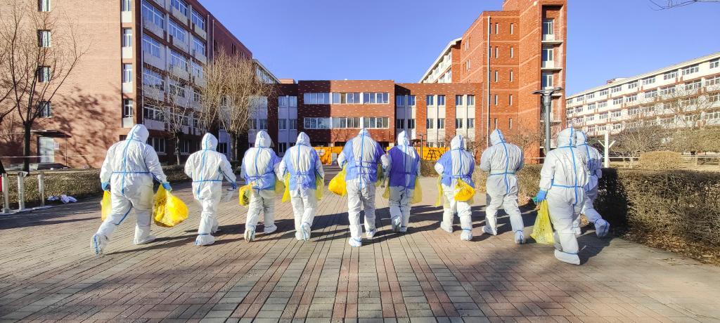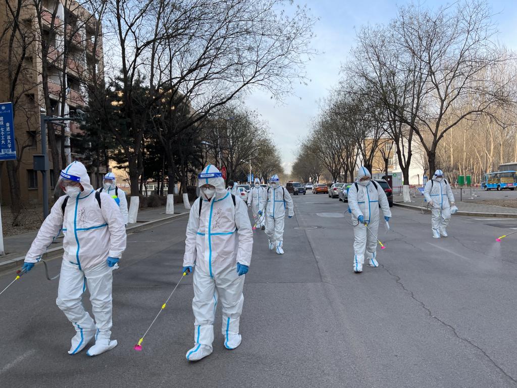 校園保衛戰如火如荼,看著自己的戰友沖鋒陷陣,校外的老師們待不住了,紛紛請戰,于是第二批志愿者隊伍很快集結完畢,30多人分赴校內和校外安置點。相比第一批志愿者,他們更清楚等待他們的是怎樣的工作環境和強度,卻逆行出征沒有半分遲疑。冷老師聽說校內運輸工作多,第二批進校時還特意借了一臺皮卡車方便大家工作。在校內,除了搬運物資,核酸掃碼,志愿者老師們還承擔起校園環境消殺的工作。40多斤重的消殺桶,平常人光負重站著就很吃力,他們卻要背著桶在零下10度的天氣里在校園各處噴灑消毒,一走就是近1個小時。
