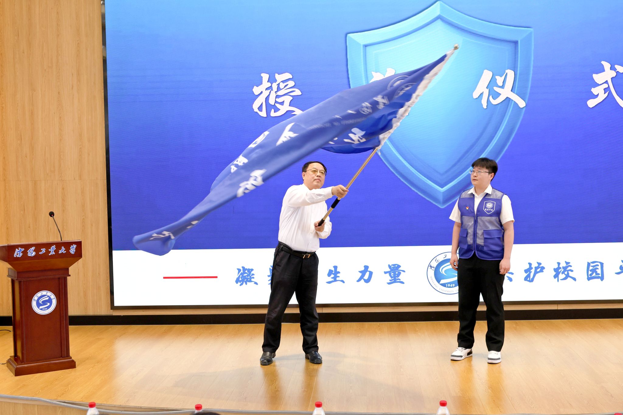 賈玉明為藍盾平安校園服務大隊授予隊旗,強調了藍盾平安校園服務大隊隊員作為學校團學組織骨干在深化平安校園建設中應發揮的作用,對隊員們提出四點期望。一是成為安全知識的“宣傳隊”。要堅持教育為先、引導為要,聚焦師生生命財產安全與身心健康防護,運用身邊典型案例和學生喜聞樂見的方式,積極傳播政策性、專業性、技術性安全知識,全面提升師生安全意識、防范能力和應急水平,營造“人人講安全、事事為安全”的濃厚氛圍。二是成為風險隱患的“信息員”。要練就一雙慧眼,在日常學習生活中敏銳洞察潛在的安全風險隱患,構建高效靈敏的信息收集與傳遞網絡,人人爭當校園安全的“吹哨人”。時刻關注消防、食品、交通、心理等關鍵領域,對苗頭性、傾向性問題,早發現、早報告、早處置。三是成為身邊同學的“貼心人”。要以真誠關愛凝聚人心,主動調解矛盾糾紛,維護良好同學關系,做團結和諧氛圍的營造者和促進派。要弘揚無私奉獻精神,危難之處顯身手,傳遞溫暖與善意,爭做深受同學信賴的“工大好人”。四是成為校園安全的“守護者”。要主動扛起守護校園安全的神圣職責,做好監督檢查、安全提示、危機報告等工作,成為維護校園穩定的堅實力量。要在團隊協作中涵育愛校情懷,提升能力本領,促進自身全面成長,以實際行動詮釋“校園安全守護者”的使命擔當。