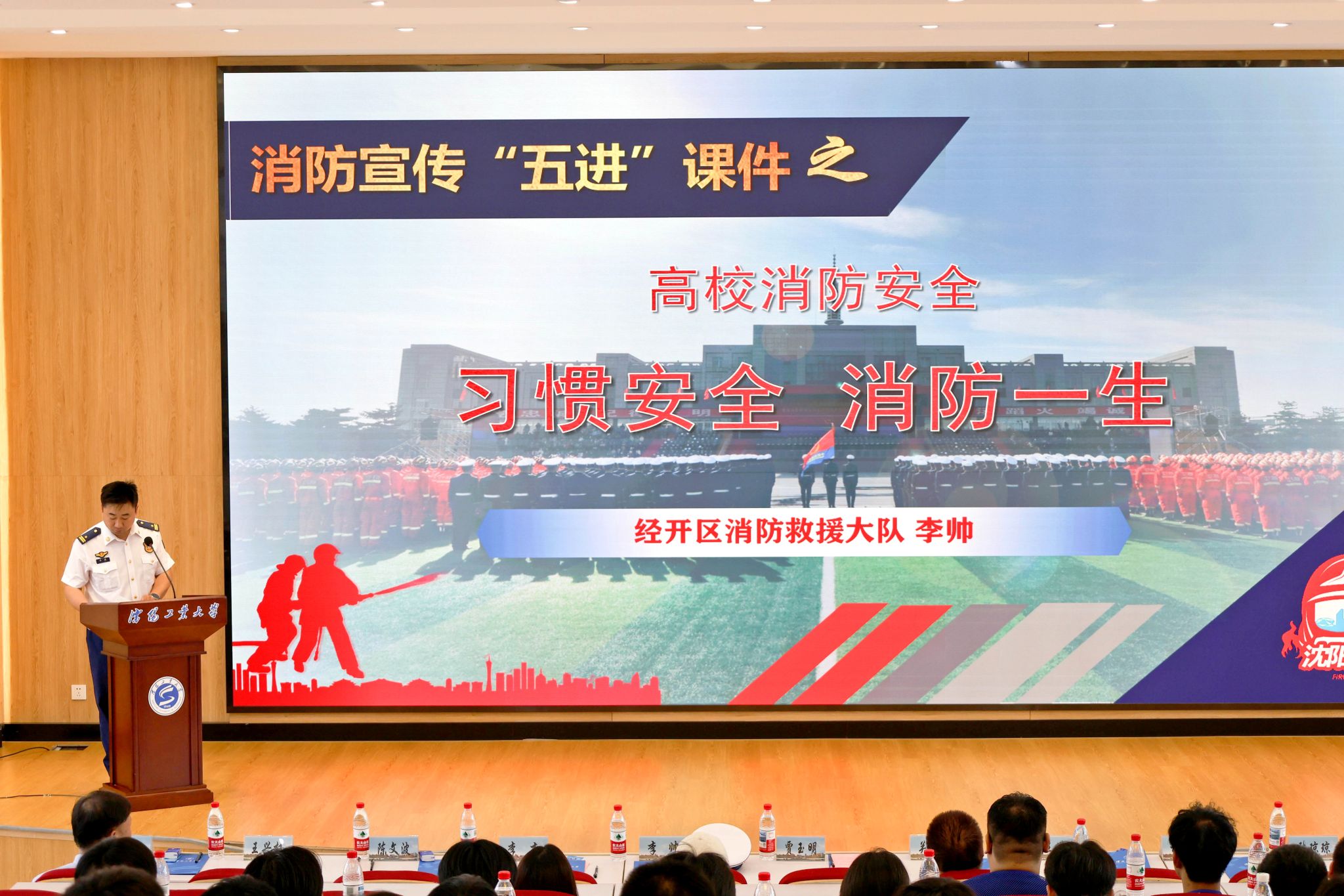 授旗儀式后,為提升服務大隊的專業能力,開發區消防大隊李帥為藍盾平安校園服務大隊及各學院中隊與會隊員開展了專題業務培訓,通過針對性的消防知識與應急處置講解,為這支校園平安建設年輕隊伍賦能強基。