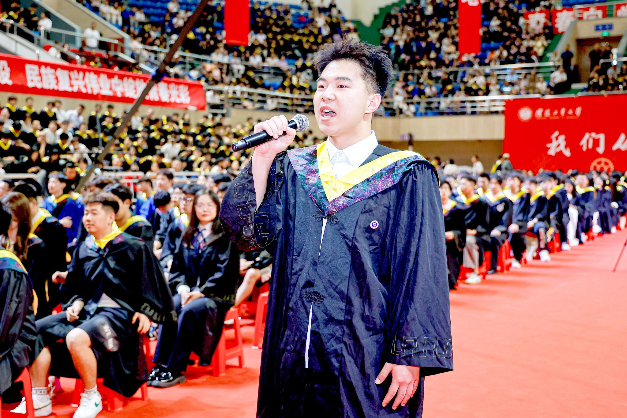畢業生代表權帥帶領全體畢業生向母校莊嚴宣誓,將始終牢記工大校訓,弘揚工大精神,為實現中國式現代化而不懈奮斗。隨后,全場齊唱校歌,熟悉的旋律中飽含著對母校的眷戀與成才報國的堅定信念。