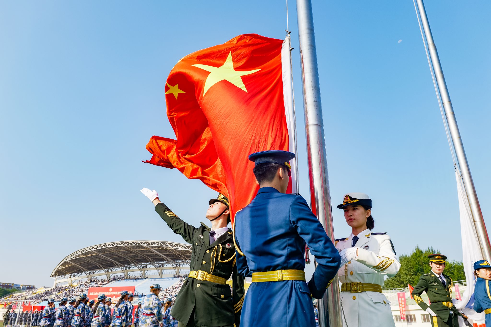 在雄壯的國歌聲中,鮮艷的五星紅旗冉冉升起,全場師生齊唱國歌,行注目禮。
