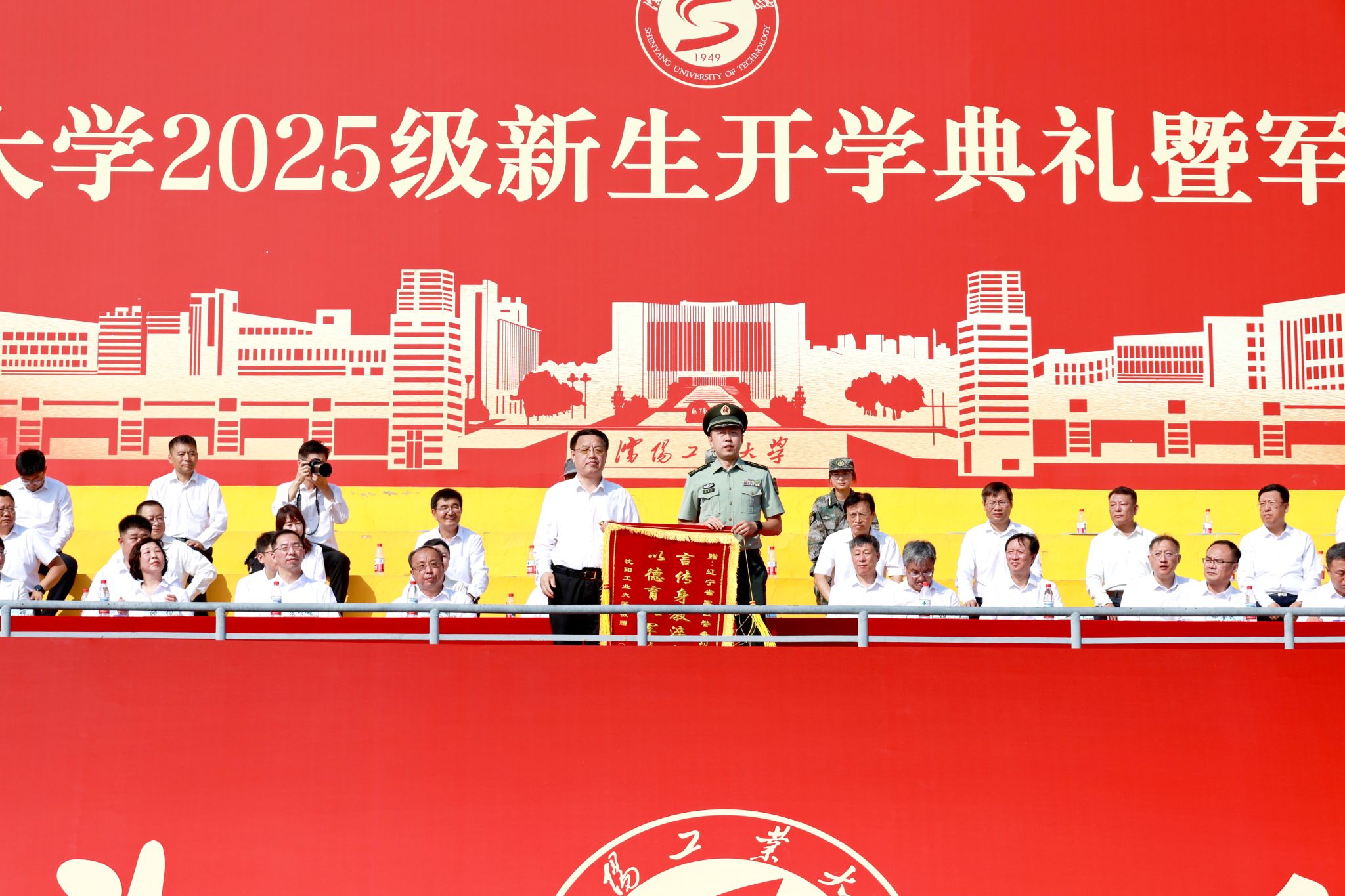 典禮現(xiàn)場,賈玉明為2025級新生代表授旗。這面承載著學校歷史與榮耀的旗幟,在新一代“工大人”手中完成了莊嚴的傳遞,也象征著學校精神血脈的延續(xù)與傳承。