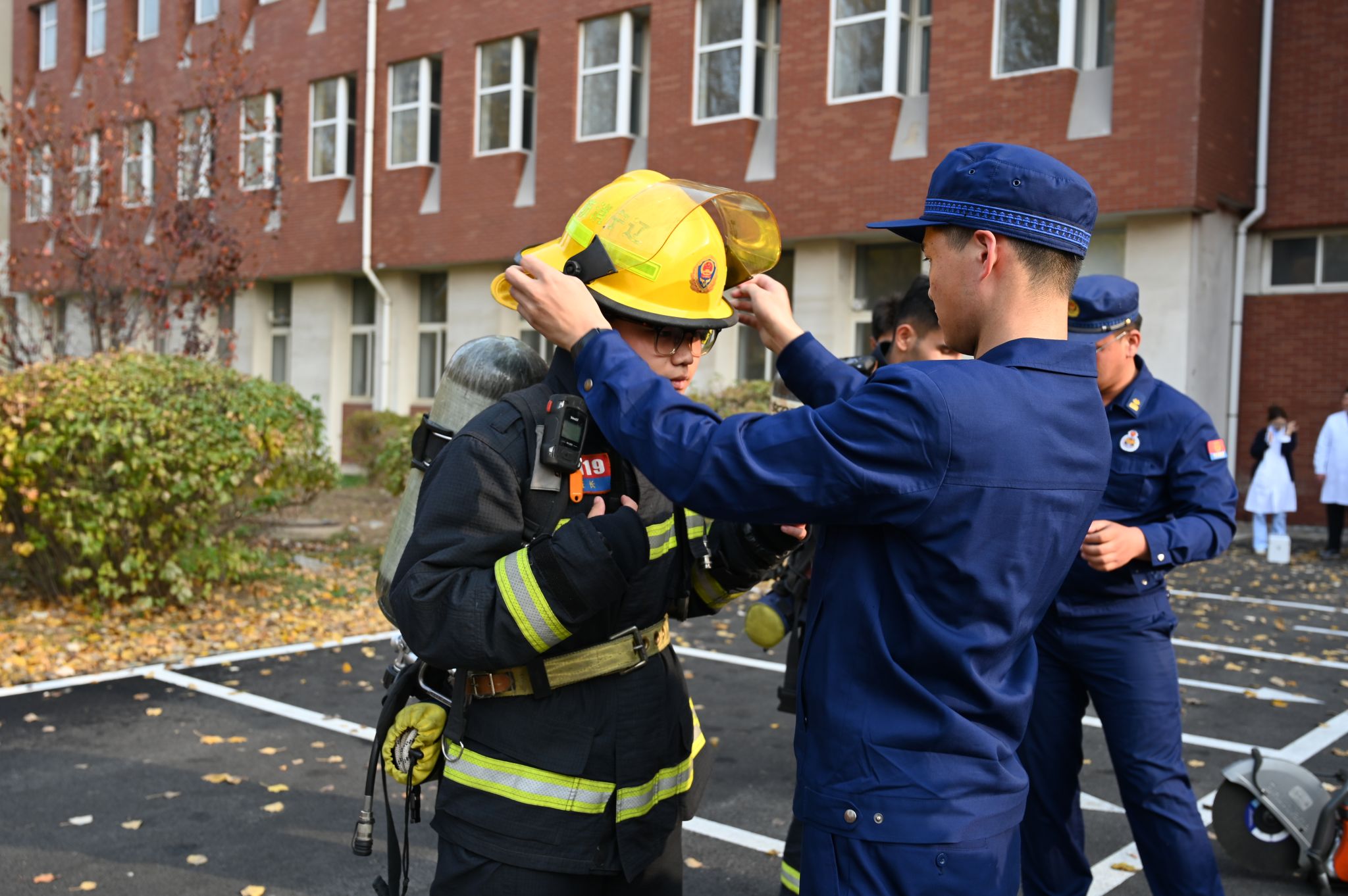 演練總指揮、黨委常委、副校長聶鵬宣布活動正式開始。演練活動現場模擬樓體突發火災,火勢較大且有人員被困,濃煙不斷冒出。學生立即撥打119報警電話,同時向校園110指揮中心報警并請求支援。公安處接到報警后立即啟動火災救援應急預案,應急疏散組、安全警戒組、滅火救援組、醫療救護組、后勤保障組等相繼快速趕到現場,被困學生在現場人員的組織引導下快速有序撤離火災現場。隨后到達的消防救援人員迅速展開行動,消防云梯車高空救援、火災現場被困人員搜救、水炮滅火等演習科目緊張有序。