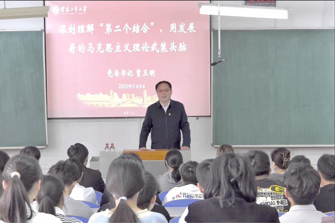 11月4日,黨委書記賈玉明以“深刻理解‘第二個結(jié)合’,用發(fā)展著的馬克思主義理論武裝頭腦”為題,為信息科學(xué)與工程學(xué)院學(xué)生講授了一堂生動精彩的思政課。