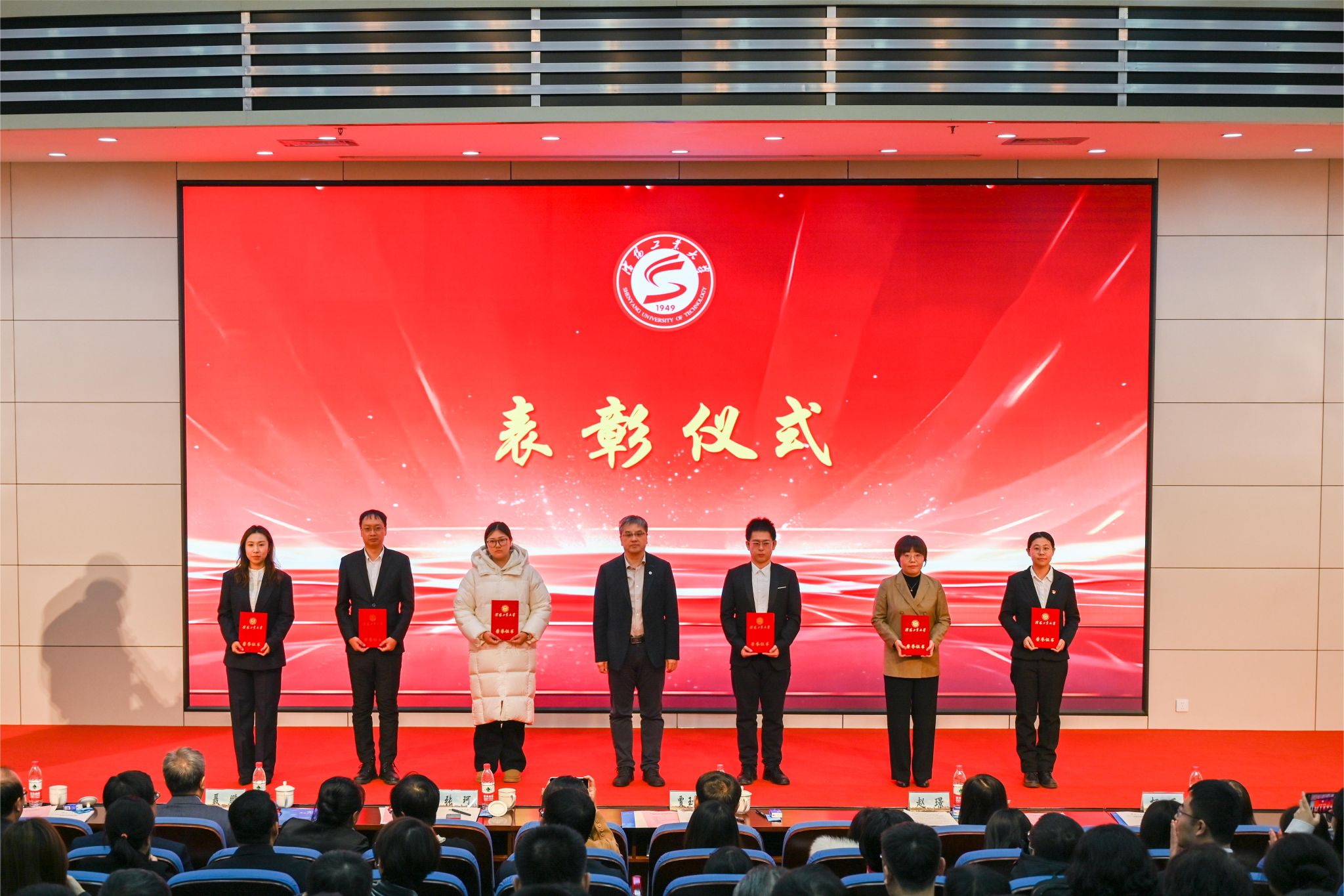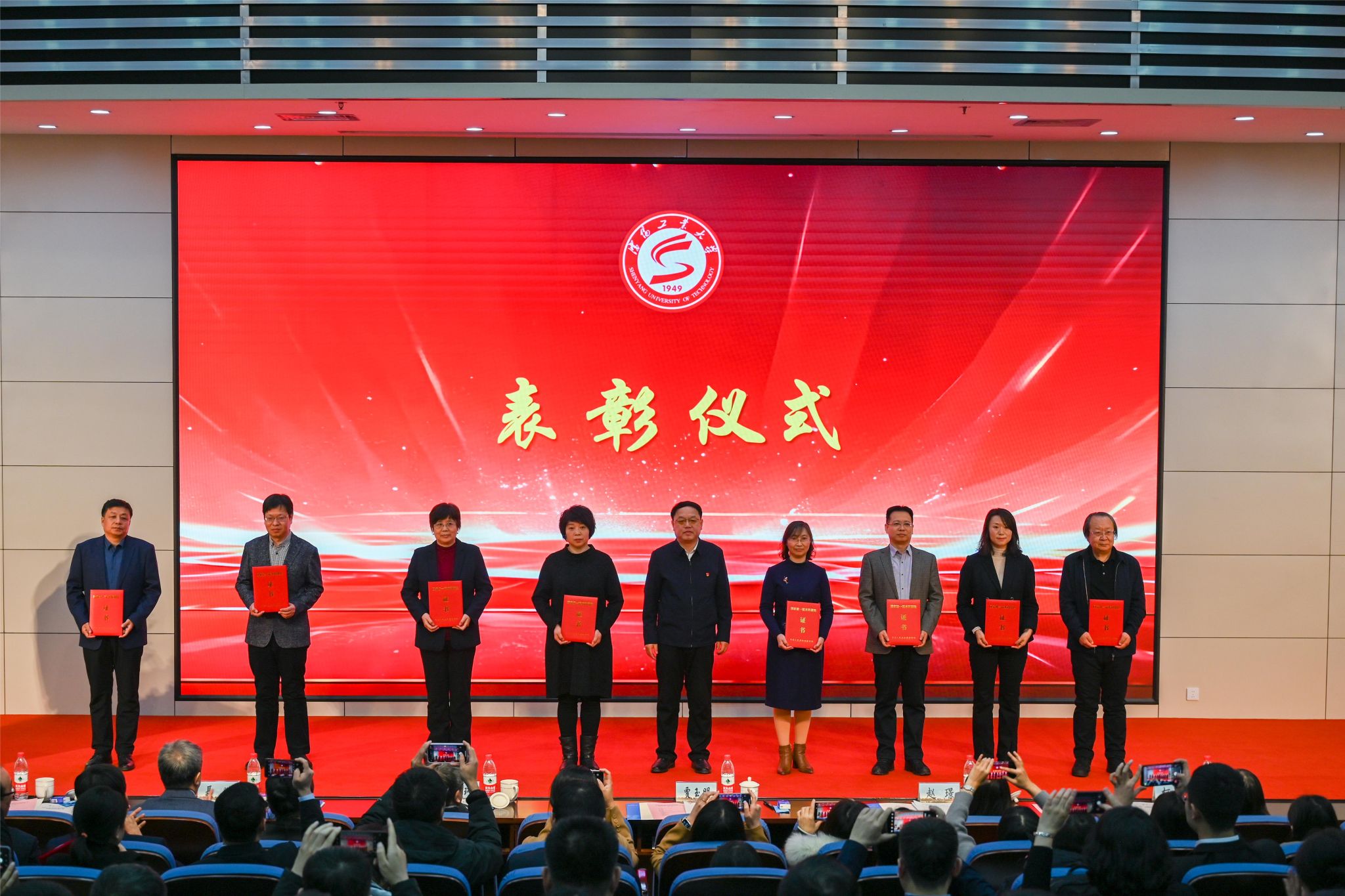 大會對2023年以來獲得本科教育教學相關榮譽的集體和個人進行了表彰,黨委副書記趙璟宣讀表彰文件,校領導分別為獲獎者頒獎并合影留念。