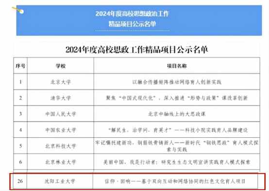 近日,教育部公布了2024年度高校思想政治工作質量提升綜合改革與精品建設項目遴選結果,我校2個項目入選,獲獎數量居省內高校首位。其中《信仰·回響一一基于雙向互動和網絡協同的紅色文化育人項目》獲評2024年度高校思想政治工作精品項目,信仰行路人輔導員名師工作室獲評2024年度高校輔導員名師工作室。