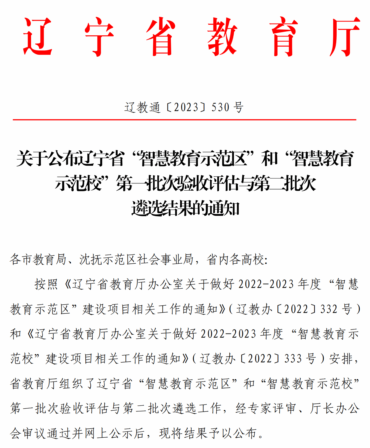 近日,遼寧省教育廳發布《關于公布遼寧省“智慧教育示范區”和“智慧教育示范校”第一批次驗收評估與第二批次遴選結果的通知》(遼教通〔2023〕530 號),我校順利通過驗收評估,獲評遼寧省首批“智慧教育示范校”。