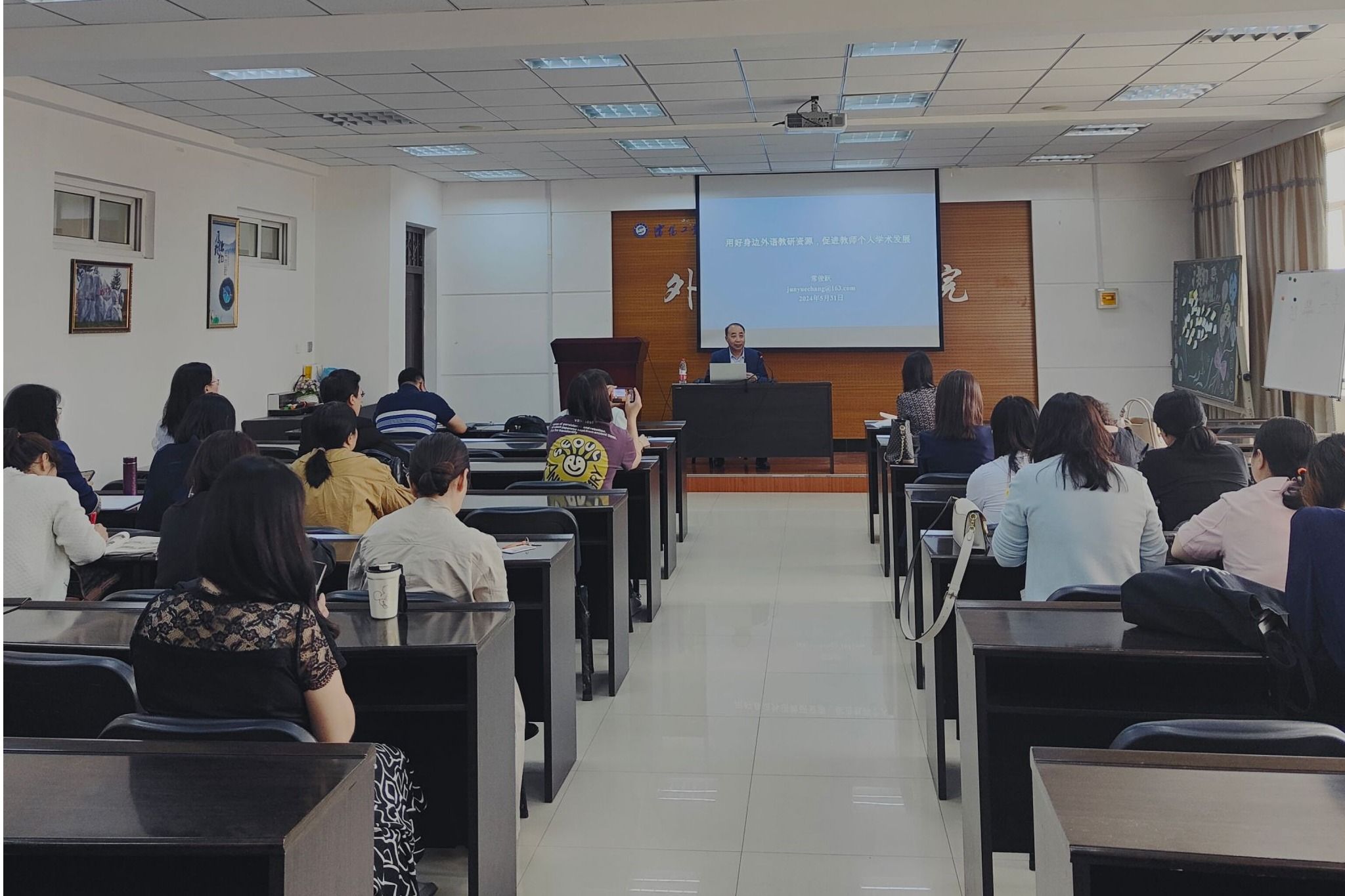 5月31日,應外國語學院院長李田新邀請,大連外國語大學原副校長、博士生導師、國家級人才、國家級教學成果獎獲得者常俊躍教授到我校做學術交流。學術交流會由李田新主持,外國語學院黨總支書記杜振君、副院長尚菲菲以及學院全體教師參加活動。