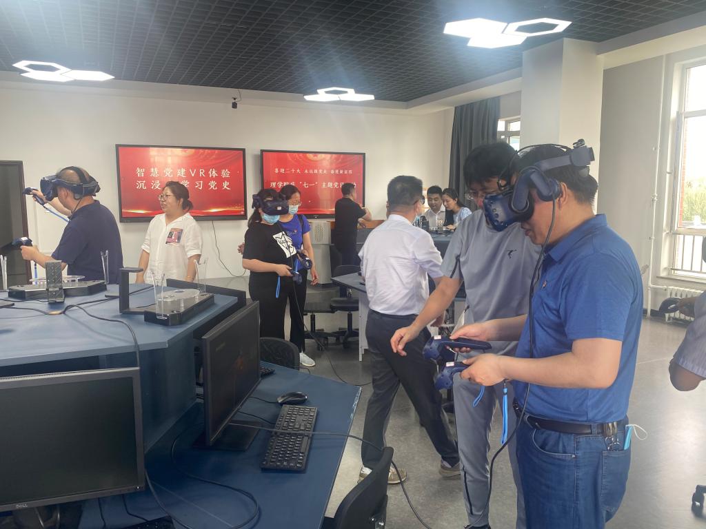 7月1日,理學院黨總支充分發揮學院資源優勢,在大學物理實驗中心虛擬仿真實驗室內舉辦“智慧黨建VR體驗 沉浸式學習黨史”活動,黨員們通過VR技術暢游全景“黨史館”,實景感受“飛奪瀘定橋戰役”、“狼牙山五壯士”和“長征雪山”等虛擬仿真場景,實景感受曾經的篳路藍縷,親身體驗艱苦的斗爭歲月。創新的學習教育形式,既有“黨味”又有“情味”,既有“鮮味”又能“回味”,不僅激發了學習興趣,也增強了教育效果。此外,理學院黨總支還邀請了遼寧省委黨史研究室科研規劃部部長王全有以“學習百年黨史弘揚偉大建黨精神”為題講授黨課,召開黨員代表座談會,共學習、話初心、謀發展。