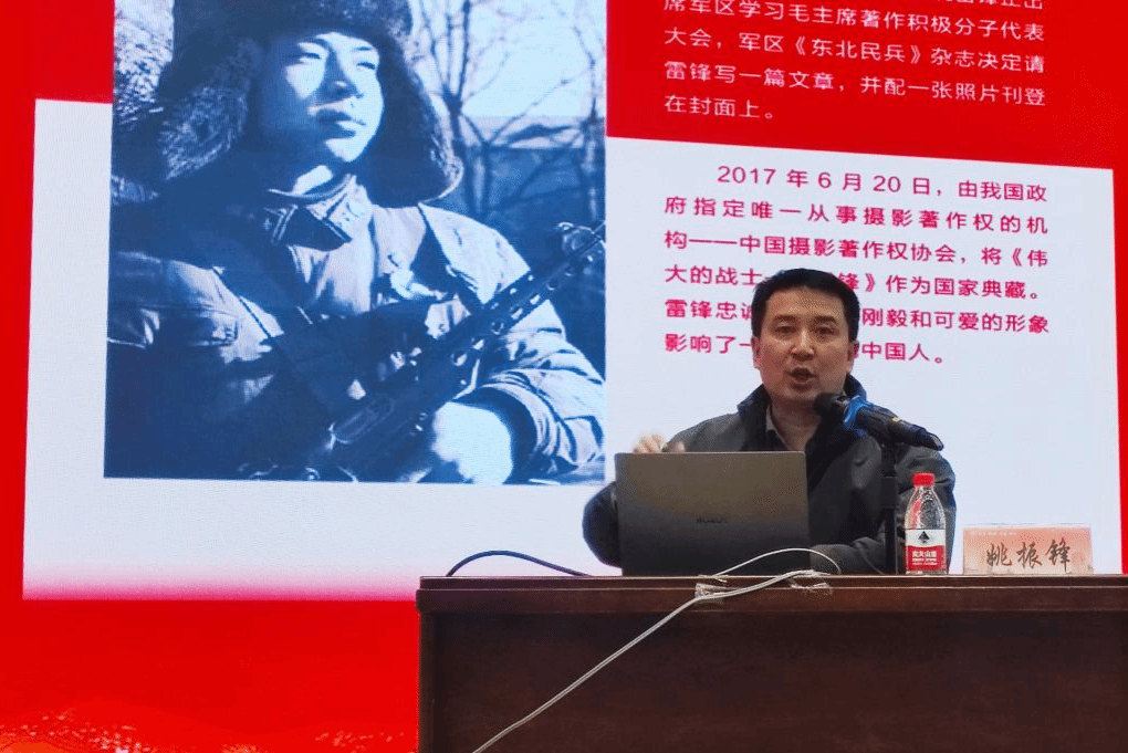講座從《鏡頭里的英雄故事》紀錄片開始,展現了姚振鋒多年來在國防教育和紅色文化傳播方面所做的成就。他用精美的照片、生動的語言、詳實的事例,講述了雷鋒同志生前的先進事跡。他通過講述連續參加11次抗美援朝志愿軍烈士遺骸迎回祖國儀式拍攝經歷以及采訪拍攝24名雷鋒班歷任班長、228名抗美援朝老戰士等英雄人物的切身感受,讓現場師生深受感動和啟發。同時,他向馬克思主義學院贈送了一尊雷鋒雕像。