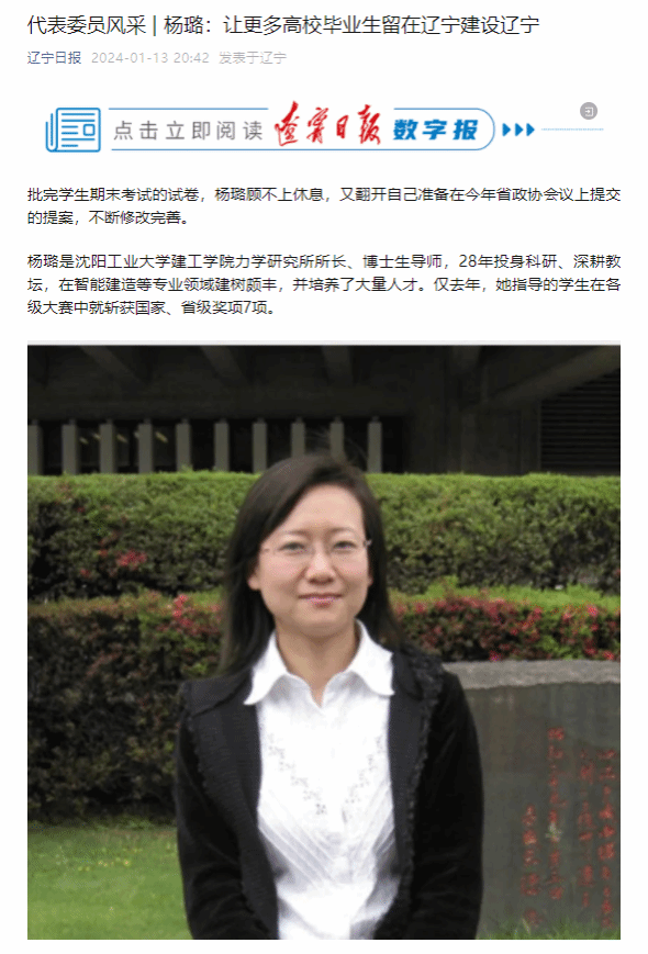 楊璐是沈陽工業(yè)大學(xué)建工學(xué)院力學(xué)研究所所長(zhǎng)、博士生導(dǎo)師,28年投身科研、深耕教壇,在智能建造等專業(yè)領(lǐng)域建樹頗豐,并培養(yǎng)了大量人才。僅去年,她指導(dǎo)的學(xué)生在各級(jí)大賽中就斬獲國(guó)家、省級(jí)獎(jiǎng)項(xiàng)7項(xiàng)。