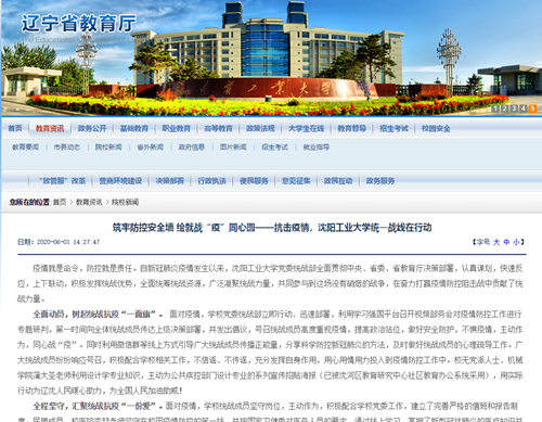 6月1日,遼寧省教育廳官方網站以“筑牢防控安全墻 繪就戰‘疫’同心圓”為題對我校廣大統一戰線成員發揮優勢作用,強化使命擔當,積極投身疫情防控狙擊戰的事跡進行了報道。