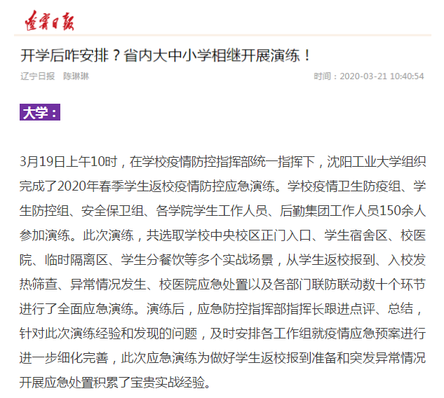 3月20日,遼寧日報客戶端、東北新聞網(wǎng)、北國網(wǎng)等多家媒體平臺報道了我校開展2020年春季學生返校疫情防控應急演練。報道中指出,在學校疫情防控指揮部統(tǒng)一指揮下,學校疫情衛(wèi)生防疫組、學生防控組、安全保衛(wèi)組、各學院學生工作人員、后勤集團工作人員150余人參加演練。此次演練,共選取學校中央校區(qū)正門入口、學生宿舍區(qū)、校醫(yī)院、臨時隔離區(qū)、學生分餐飲等多個實戰(zhàn)場景,從學生返校報到、入校發(fā)熱篩查、異常情況發(fā)生、校醫(yī)院應急處置以及各部門聯(lián)防聯(lián)動數(shù)十個環(huán)節(jié)進行了全面應急演練。演練后,應急防控指揮部指揮長跟進點評、總結,針對此次演練經(jīng)驗和發(fā)現(xiàn)的問題,及時安排各工作組就疫情應急預案進行進一步細化完善,此次應急演練為做好學生返校報到準備和突發(fā)異常情況開展應急處置積累了寶貴實戰(zhàn)經(jīng)驗。