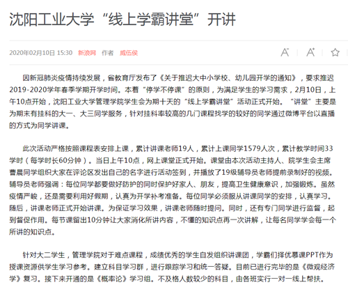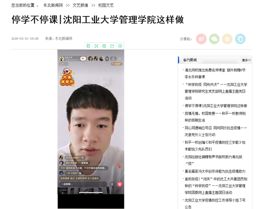 2月10日,新浪網(wǎng)、東北新聞網(wǎng)、中青校園、遼沈晚報(bào)官方微博、瀟湘晨報(bào)、二三里資訊等多家媒體平臺(tái)以“停學(xué)不停課——沈陽(yáng)工業(yè)大學(xué)管理學(xué)院這樣做”為題,報(bào)道了我校管理學(xué)院積極響應(yīng)“停課不停學(xué)”的號(hào)召,開展線上學(xué)霸講堂。報(bào)道中指出,沈陽(yáng)工業(yè)大學(xué)管理學(xué)院為全力滿足疫情期間學(xué)生的學(xué)習(xí)需求,積極創(chuàng)新舉措,充分利用網(wǎng)絡(luò)平臺(tái),通過微博平臺(tái)以直播的方式,把線下課程搬到線上,開展“線上學(xué)霸講堂”。