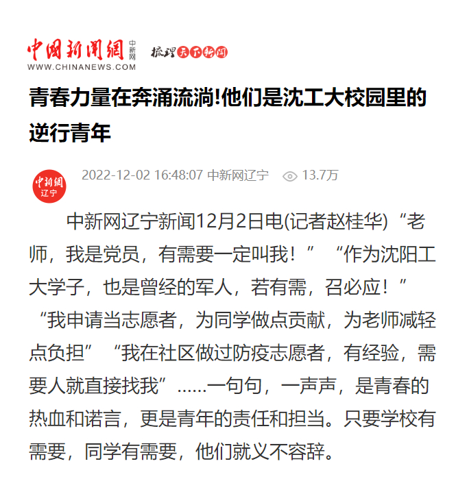 “老師,我是黨員,有需要一定叫我!”“作為沈陽工大學子,也是曾經的軍人,若有需,召必應!”“我申請當志愿者,為同學做點貢獻,為老師減輕點負擔”“我在社區做過防疫志愿者,有經驗,需要人就直接找我”……一句句,一聲聲,是青春的熱血和諾言,更是青年的責任和擔當。只要學校有需要,同學有需要,他們就義不容辭。