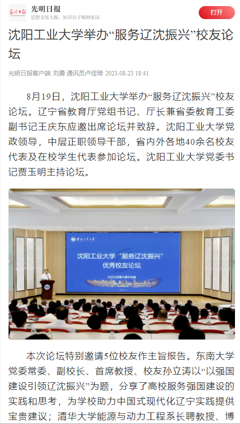 賈玉明表示,此次邀請國內知名校友回遼返沈,圍繞“服務遼沈振興”主題進行深入研討交流,是發(fā)揮校友資源優(yōu)勢,服務遼沈振興的務實舉措,沈陽工業(yè)大學將以此次論壇舉辦為契機,進一步整合學校、校友、企業(yè)資源,相互支持、合作共贏,在人才培養(yǎng)、科學研究、服務振興等方面精準發(fā)力,展現工大擔當,貢獻工大智慧。(光明日報全媒體記者劉勇 通訊員盧佳琦)