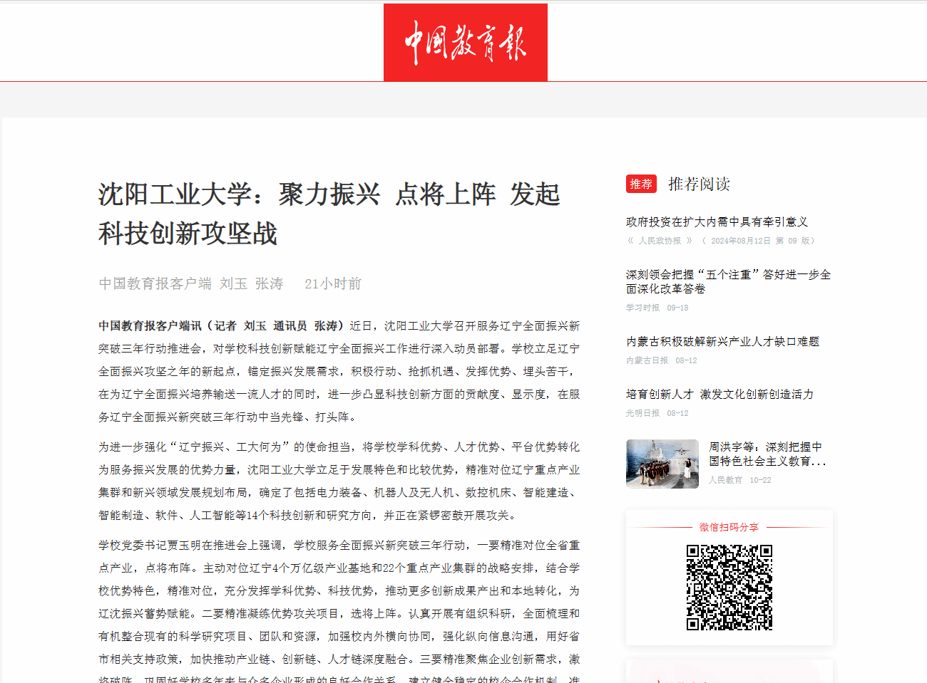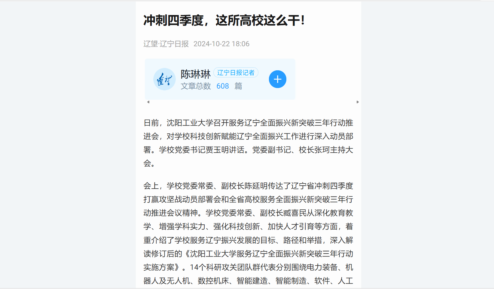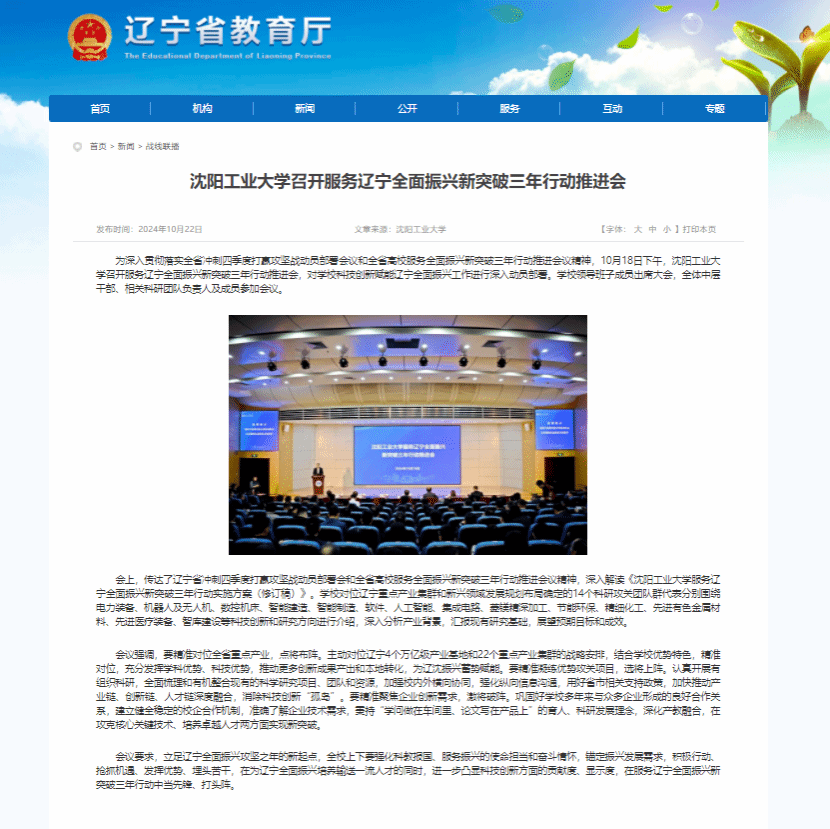 為深入貫徹落實(shí)遼寧省全省沖刺四季度打贏攻堅(jiān)戰(zhàn)動(dòng)員部署會(huì)議和全省高校服務(wù)全面振興新突破三年行動(dòng)推進(jìn)會(huì)議精神,10月18日下午,沈陽工業(yè)大學(xué)召開服務(wù)遼寧全面振興新突破三年行動(dòng)推進(jìn)會(huì)。大會(huì)的舉行引起了廣泛的關(guān)注,產(chǎn)生了強(qiáng)烈反響,中國教育報(bào)、中國工業(yè)新聞網(wǎng)、東北新聞網(wǎng)、遼望、遼寧省教育廳等媒體平臺(tái)相繼報(bào)道。