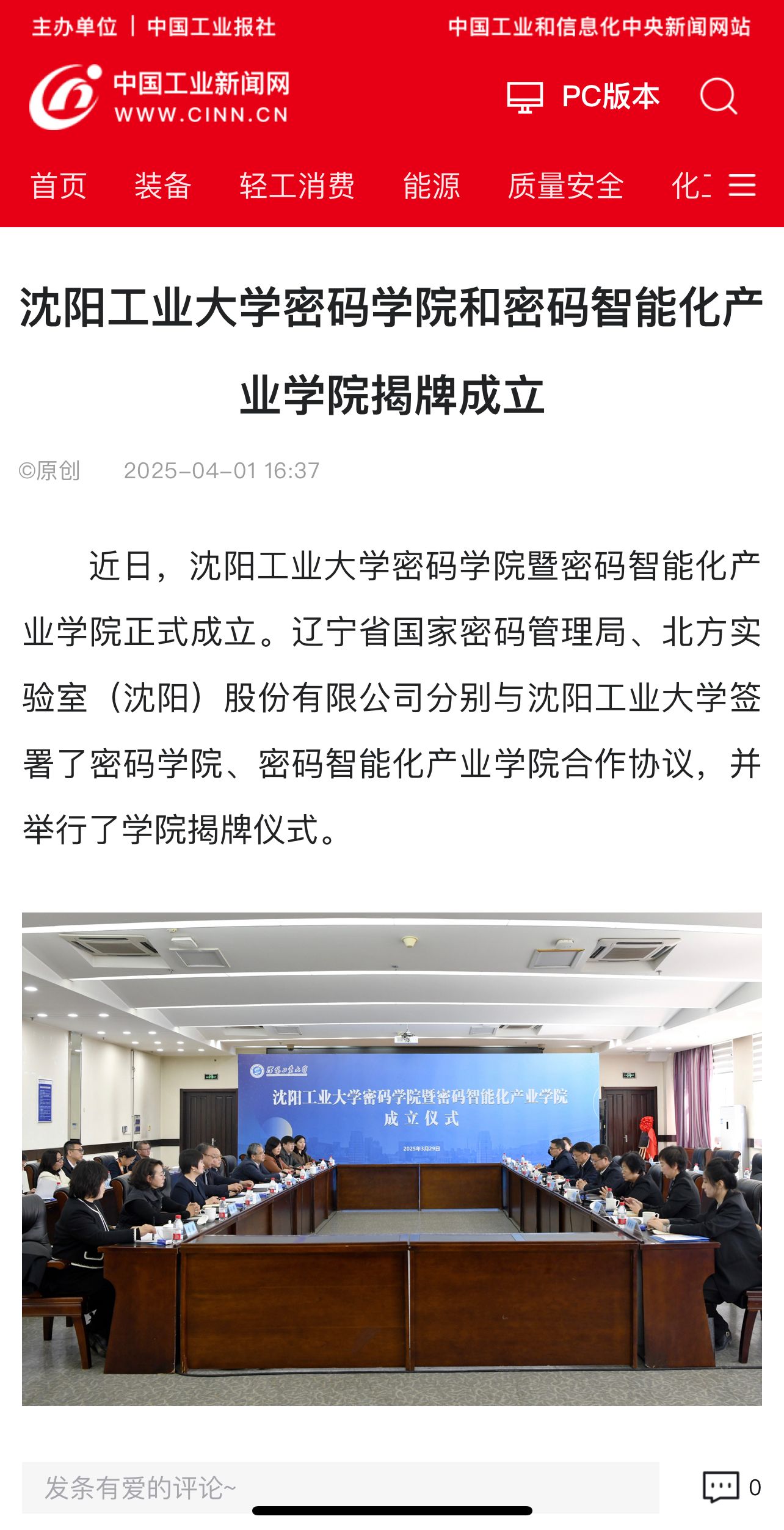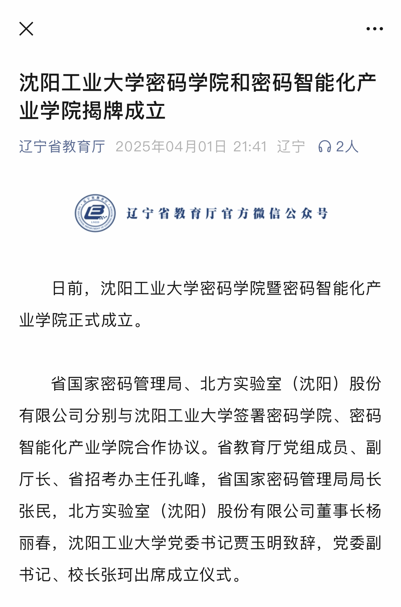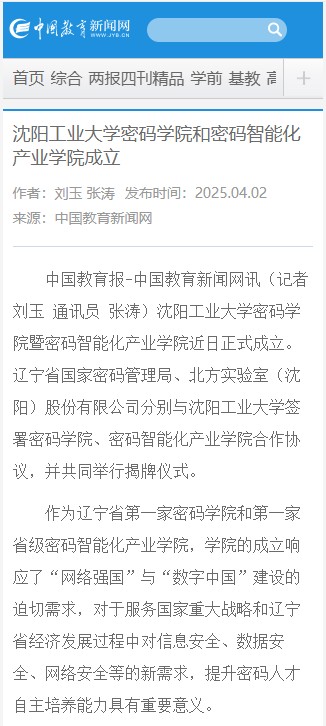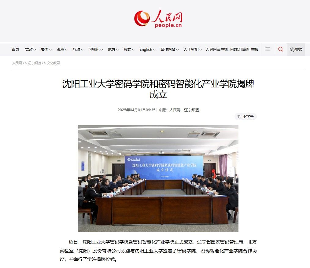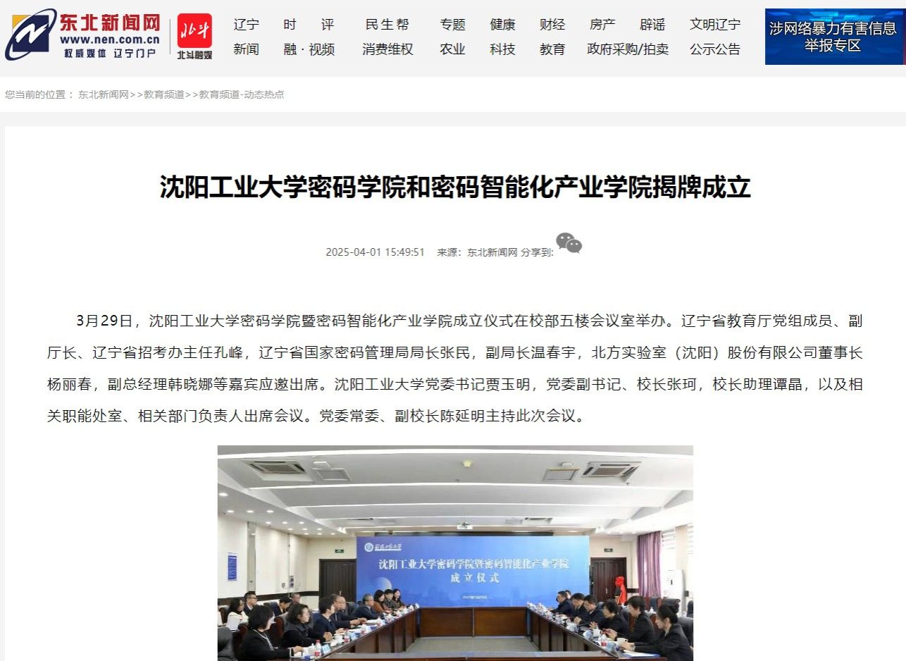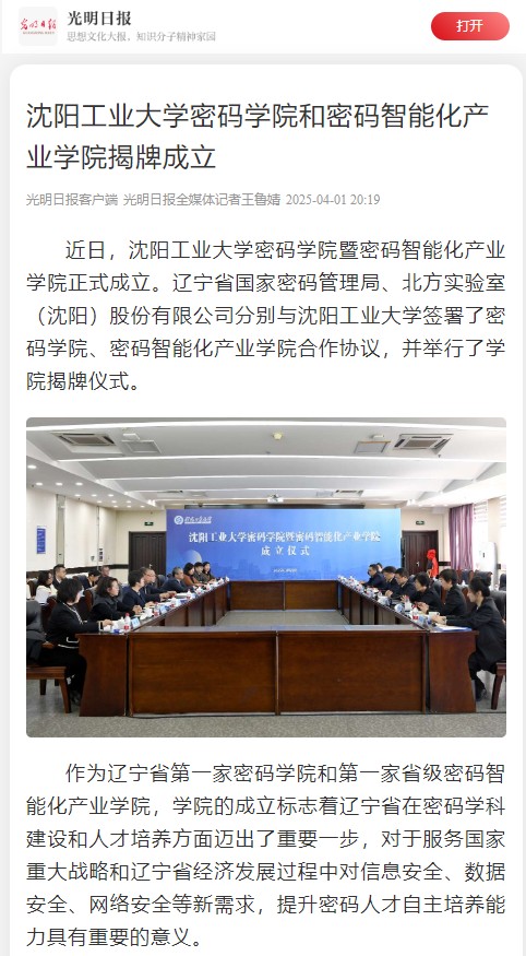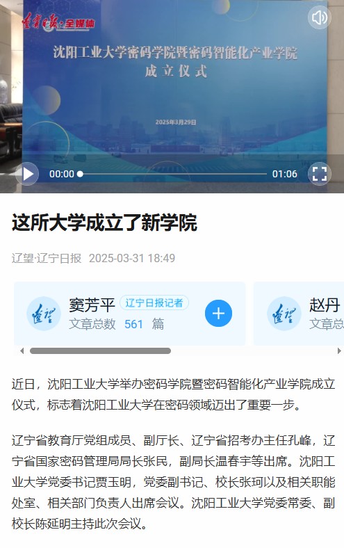3月29日,我校密碼學(xué)院暨密碼智能化產(chǎn)業(yè)學(xué)院正式成立。遼寧省國家密碼管理局、北方實驗室(沈陽)股份有限公司分別與沈陽工業(yè)大學(xué)簽署了密碼學(xué)院、密碼智能化產(chǎn)業(yè)學(xué)院合作協(xié)議,并舉行了學(xué)院揭牌儀式。多家媒體對此事進行報道。
