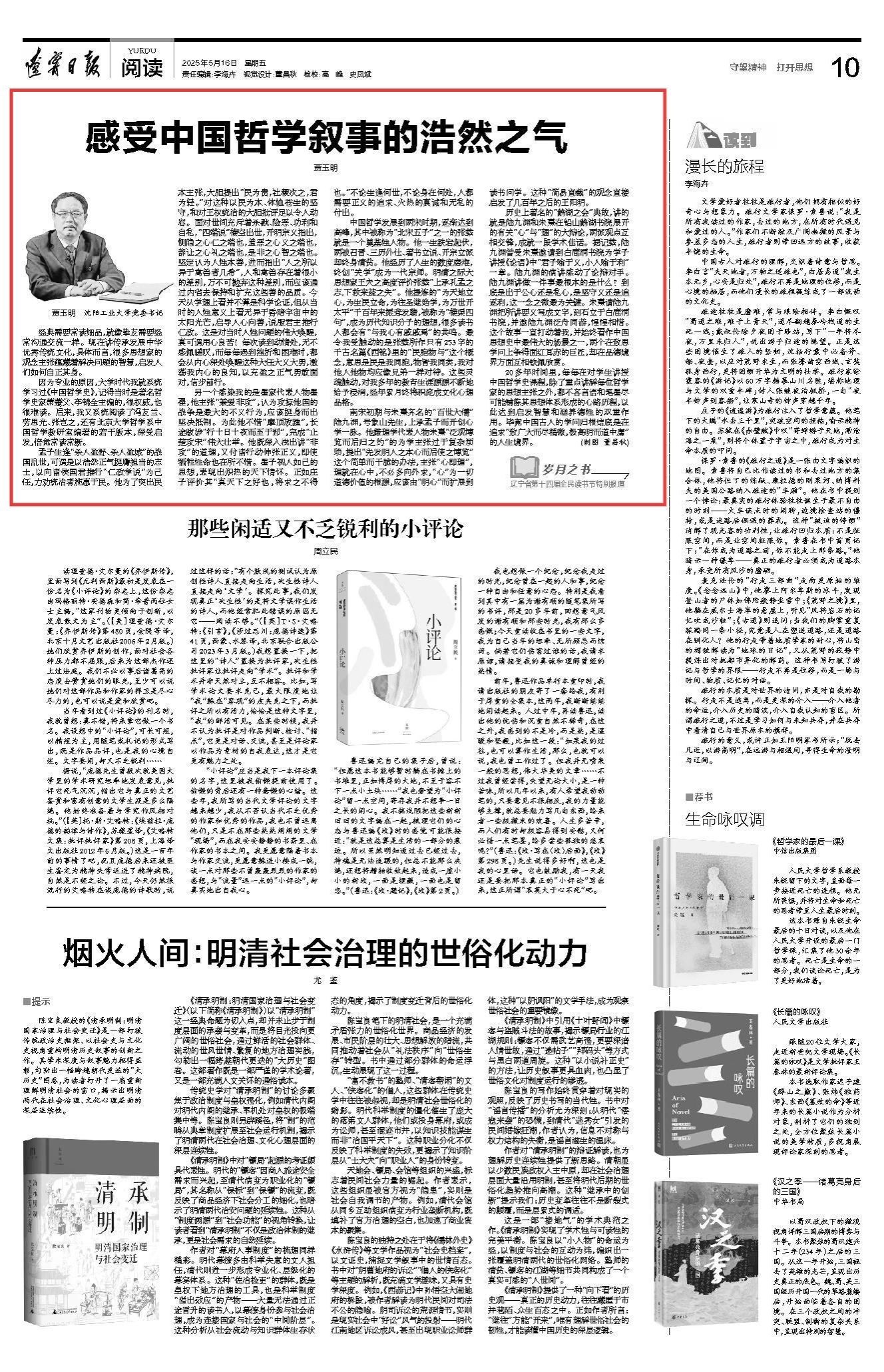 5月16日遼寧日報刊發我校黨委書記賈玉明撰寫的文章《感受中國哲學敘事的浩然正氣》