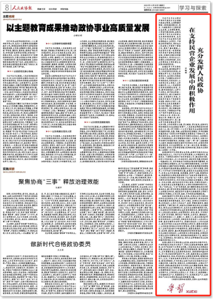 習(xí)近平總書記主持召開新時代推動?xùn)|北全面振興座談會強調(diào),全面構(gòu)建親清統(tǒng)一的新型政商關(guān)系,黨員、干部既要關(guān)心支持民營企業(yè)發(fā)展,主動排憂解難,又要堅守廉潔底線。這既充分體現(xiàn)了黨中央對民營企業(yè)發(fā)展的高度重視,也是習(xí)近平總書記在新時代新征程新起點上對黨員、干部提出的明確要求,同時也為人民政協(xié)工作指明了前進方向,提供了基本遵循。人民政協(xié)作為統(tǒng)一戰(zhàn)線的組織和具有中國特色的制度安排,是國家治理體系的重要組成部分,具有社會主義協(xié)商民主的獨特優(yōu)勢,應(yīng)充分發(fā)揮其在支持民營企業(yè)發(fā)展中的重要作用。