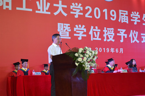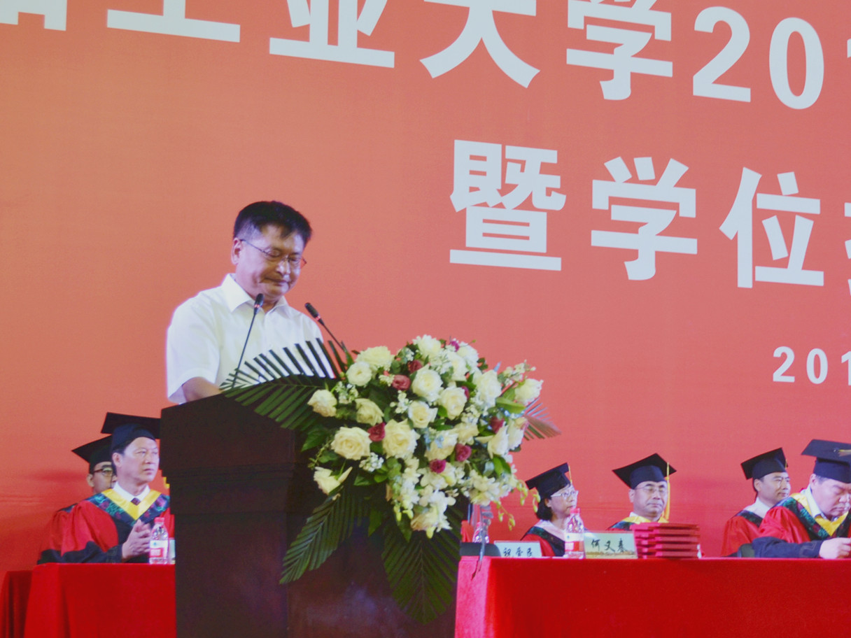 校長、校學位評定委員會主席郭連軍為畢業(yè)生代表授位,并作了題為《致敬奮斗的青春》的講話。他向圓滿完成學業(yè)的畢業(yè)生們表示真誠的祝賀,對他們開啟新征程表達了美好祝愿。郭連軍寄語全體2019屆畢業(yè)生: