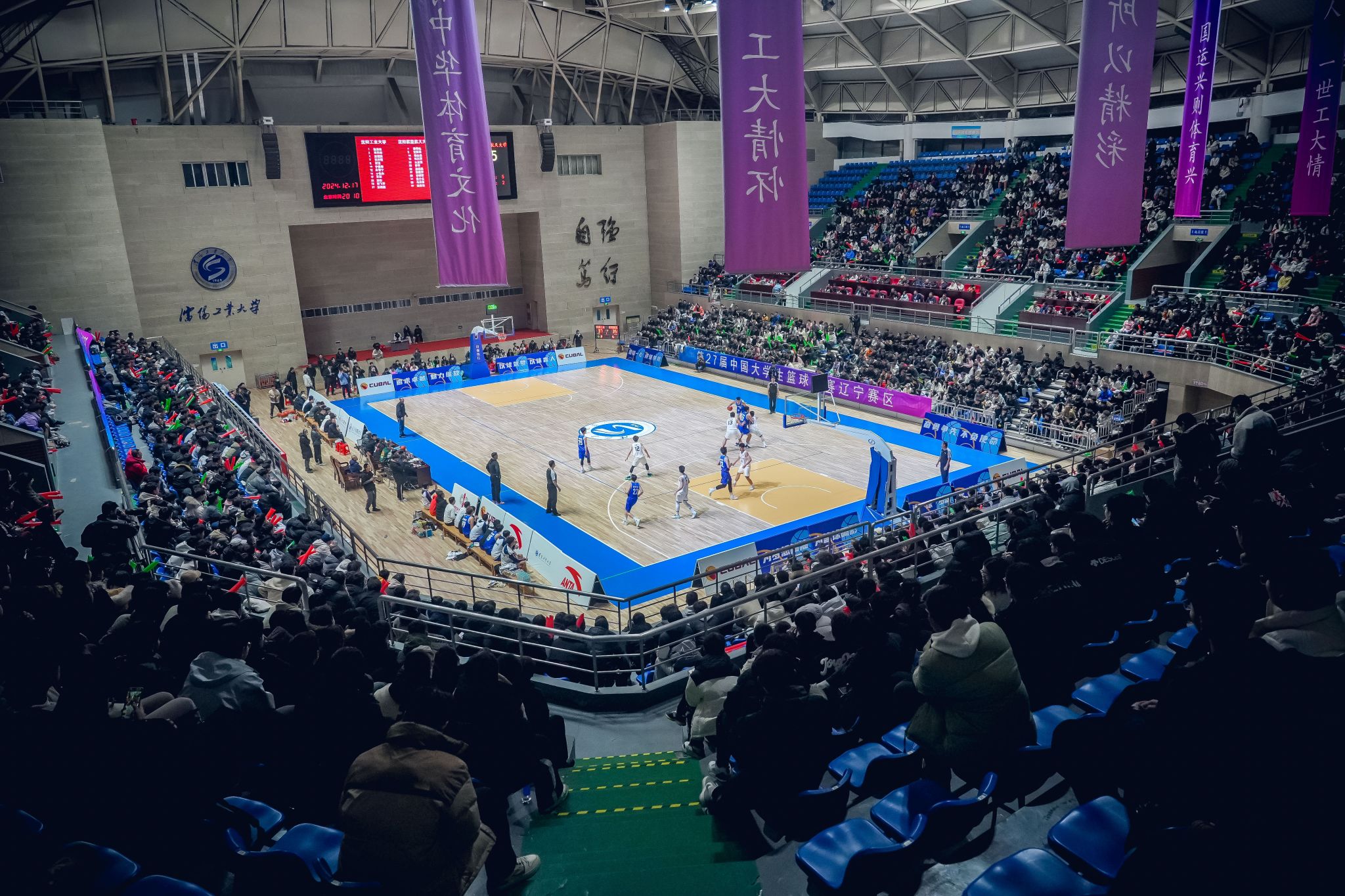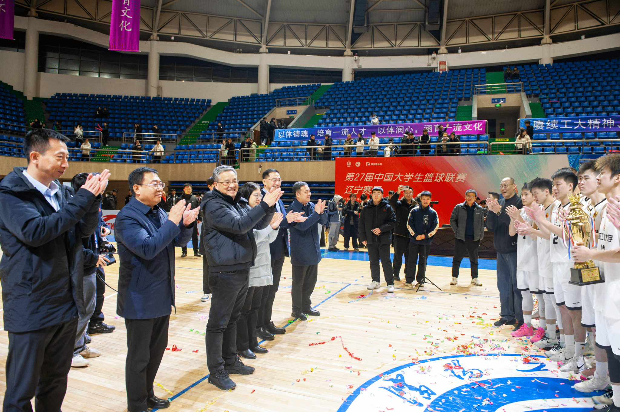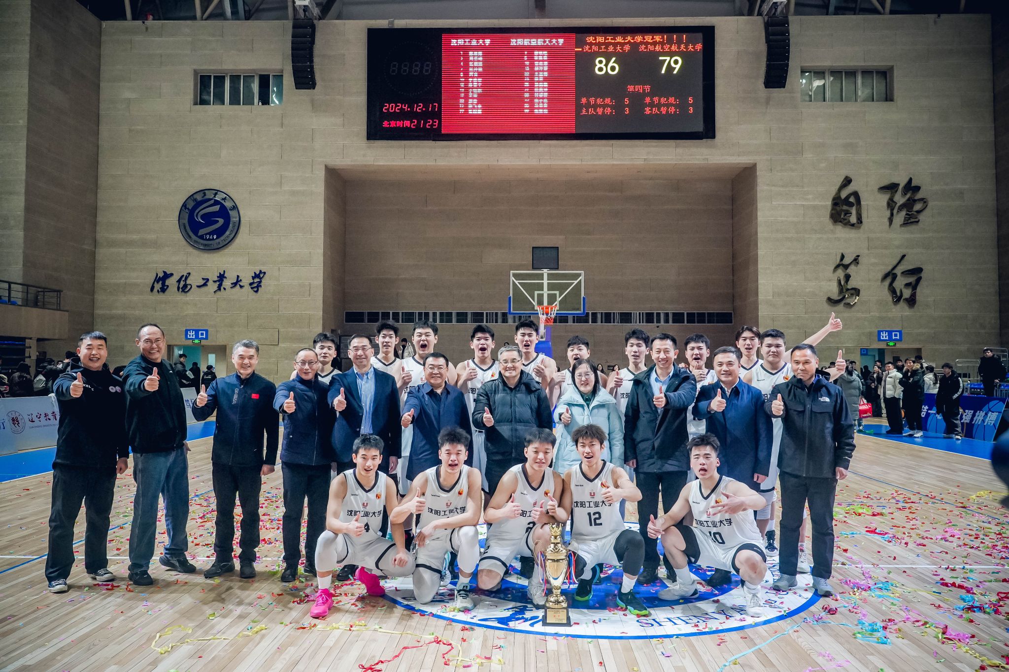 12月17日,第27屆中國大學生籃球聯賽(遼寧賽區)男子組決賽在沈陽工業大學體育館打響。經過激烈比拼,我校男子籃球隊在主場以總決賽全勝戰績成功衛冕,與女籃一起實現“一周雙冠”,繼2023年代表遼寧出征CUBAL中國大學生籃球聯賽北區賽并獲得北區總冠軍后,再次代表遼寧征戰明年的北區賽。黨委副書記、校長張珂,黨委副書記柯麗,黨委常委、紀委書記、監察專員陳衛國,黨委常委、副校長孫秋野、夏明超、王彪與四千余名師生一同在現場觀賽,為男籃隊員們鼓勁加油。