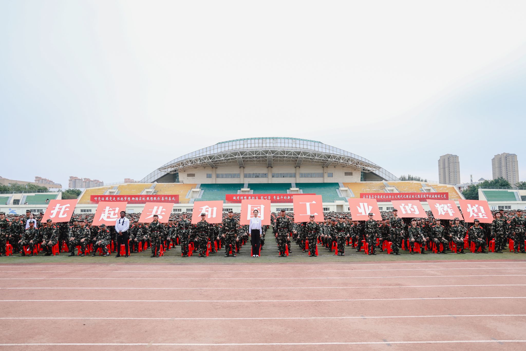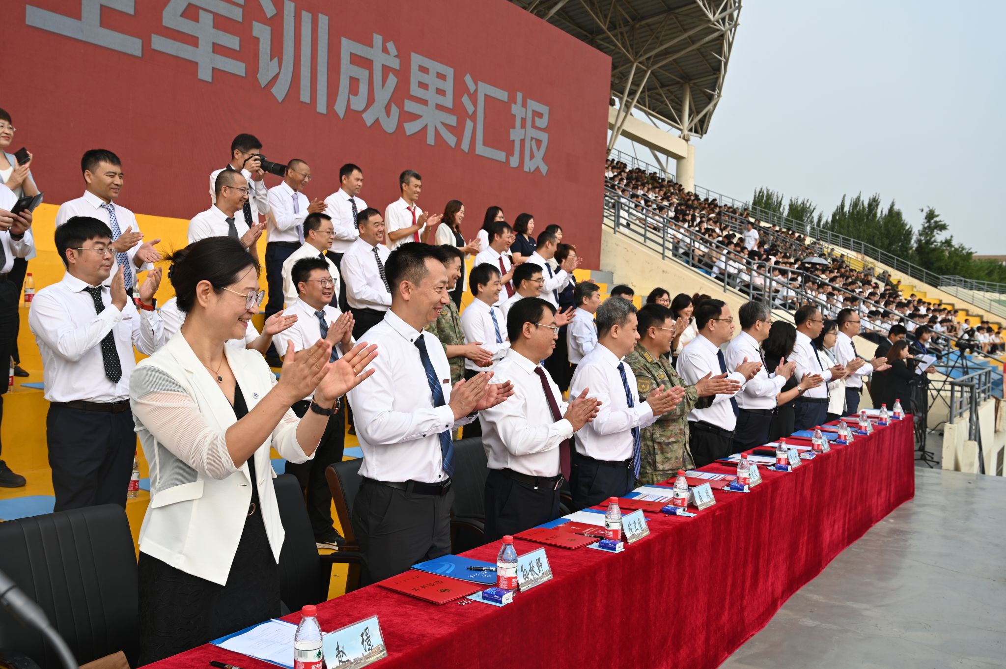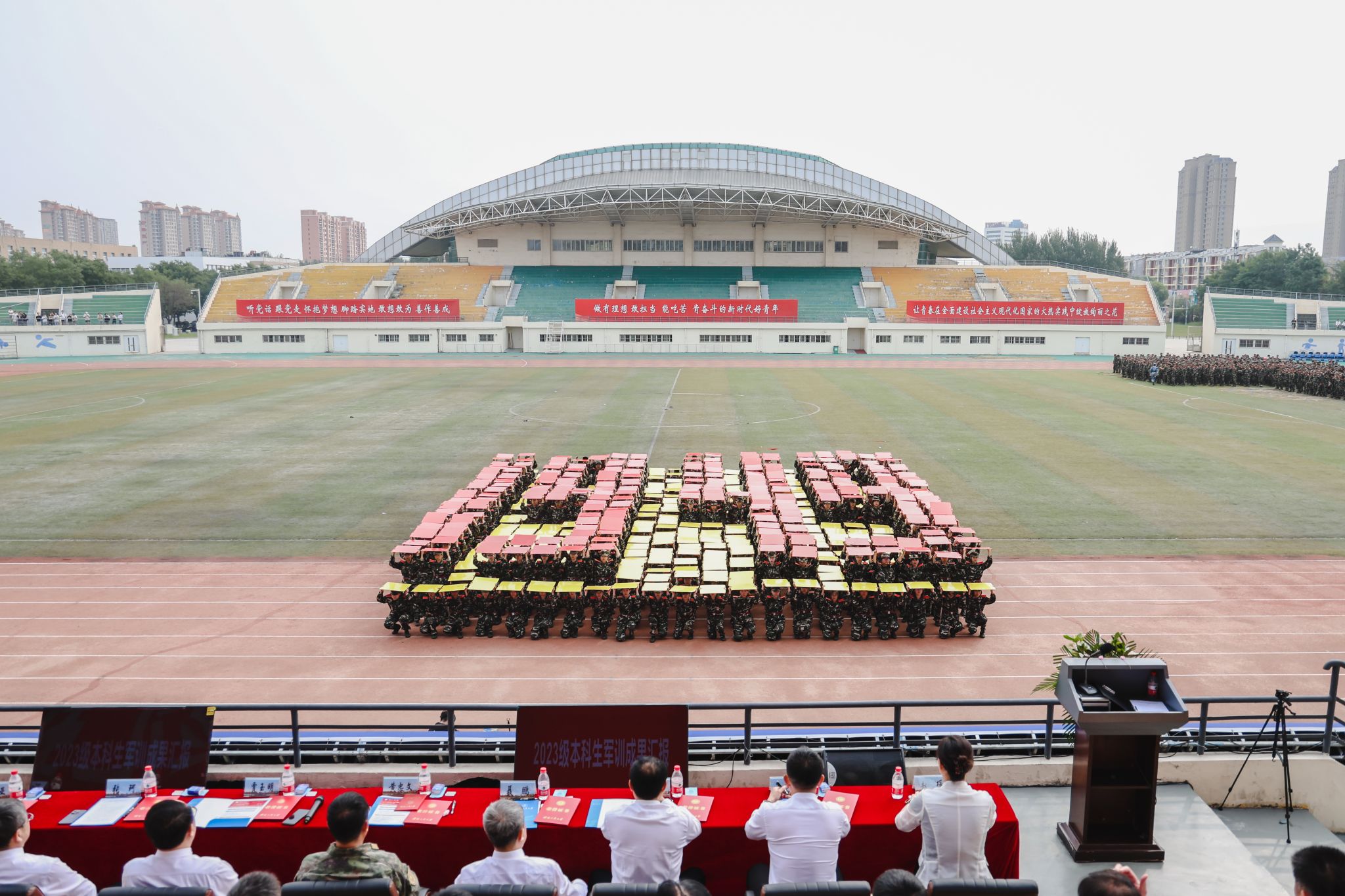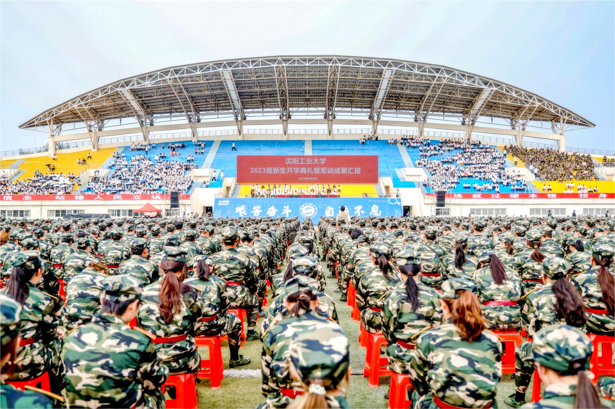 9月8日,中央校區2023級學生開學典禮暨軍訓成果匯報會在南區體育場舉行。遼寧省軍區戰備建設局大校副局長黃忠文,校領導賈玉明、張珂、聶鵬、陳延明、陳衛國、柯麗、孫秋野、臧喜民出席大會,黨委副書記趙璟主持會議。學校相關職能部門負責人、各二級學院黨政負責人、學生工作干部、軍訓教官、2023級全體學生參加大會。
