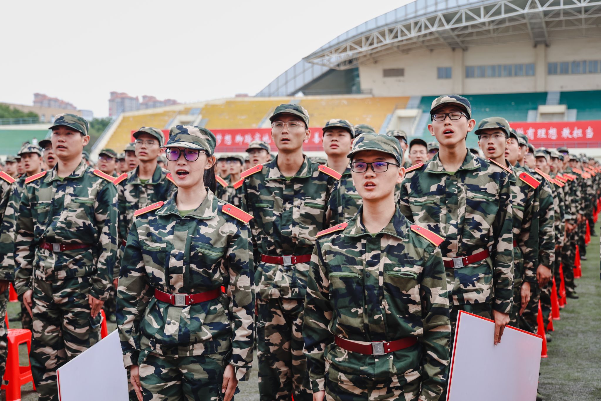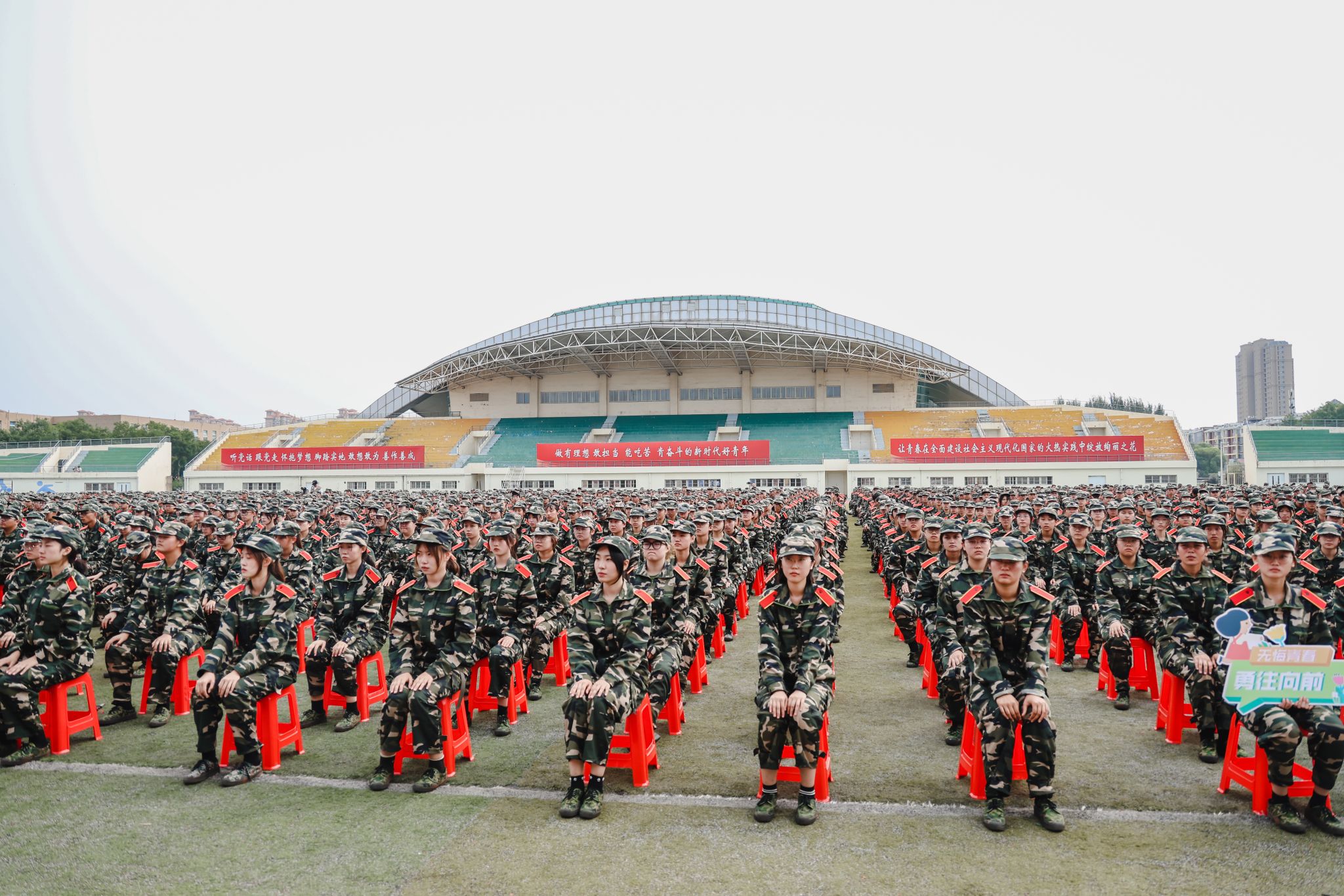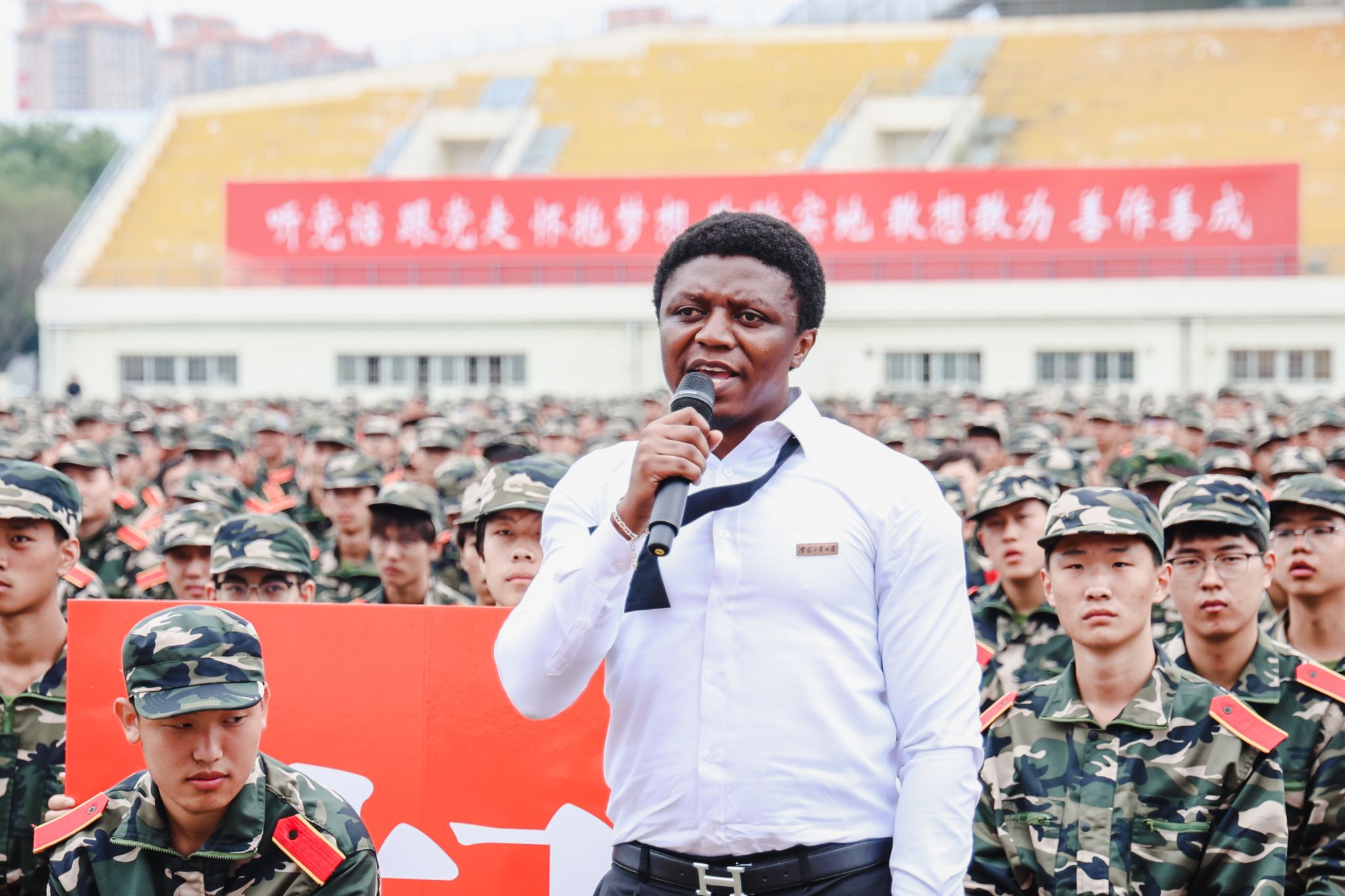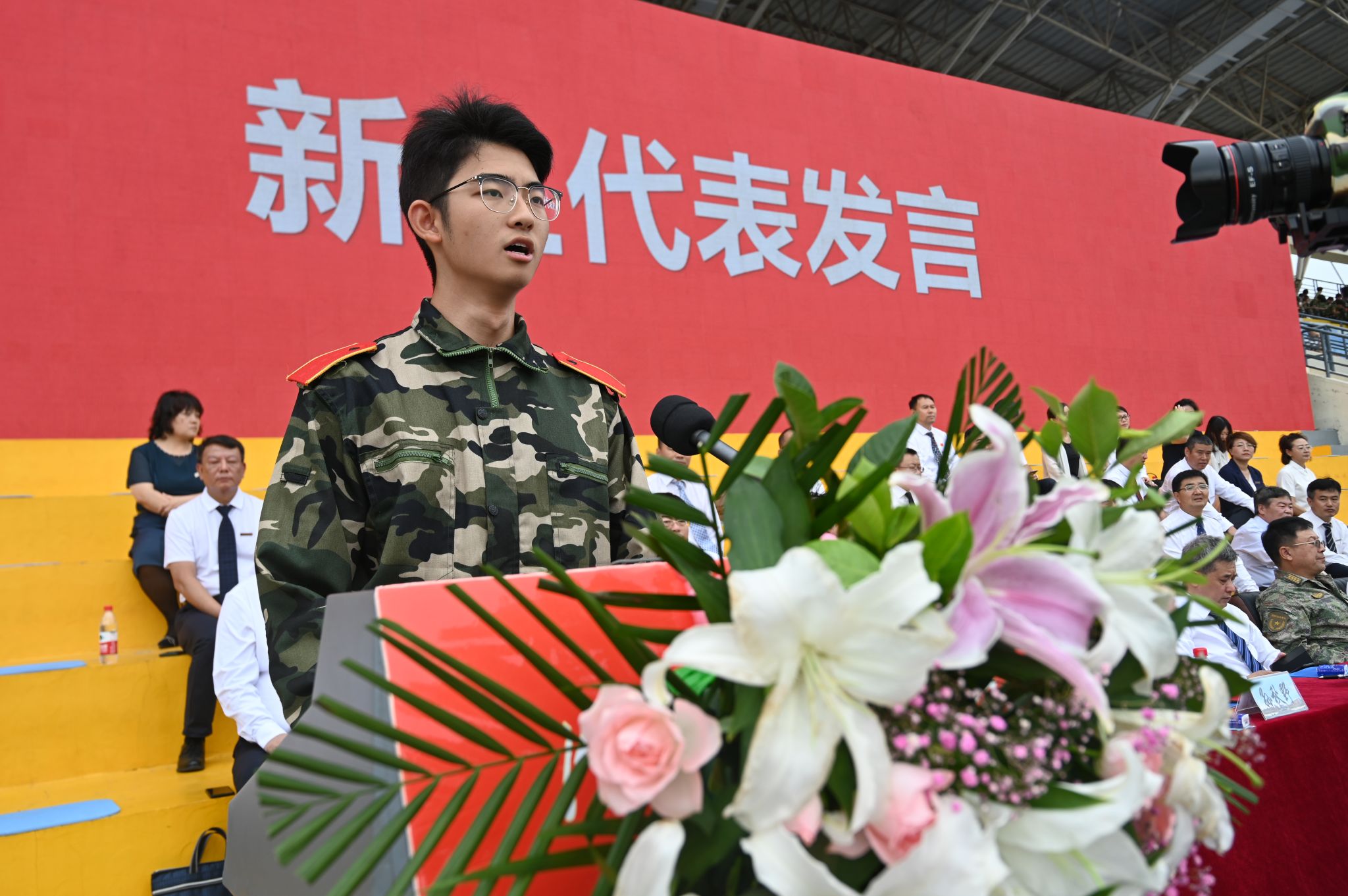 9月8日,中央校區2023級學生開學典禮暨軍訓成果匯報會在南區體育場舉行。遼寧省軍區戰備建設局大校副局長黃忠文,校領導賈玉明、張珂、聶鵬、陳延明、陳衛國、柯麗、孫秋野、臧喜民出席大會,黨委副書記趙璟主持會議。學校相關職能部門負責人、各二級學院黨政負責人、學生工作干部、軍訓教官、2023級全體學生參加大會。