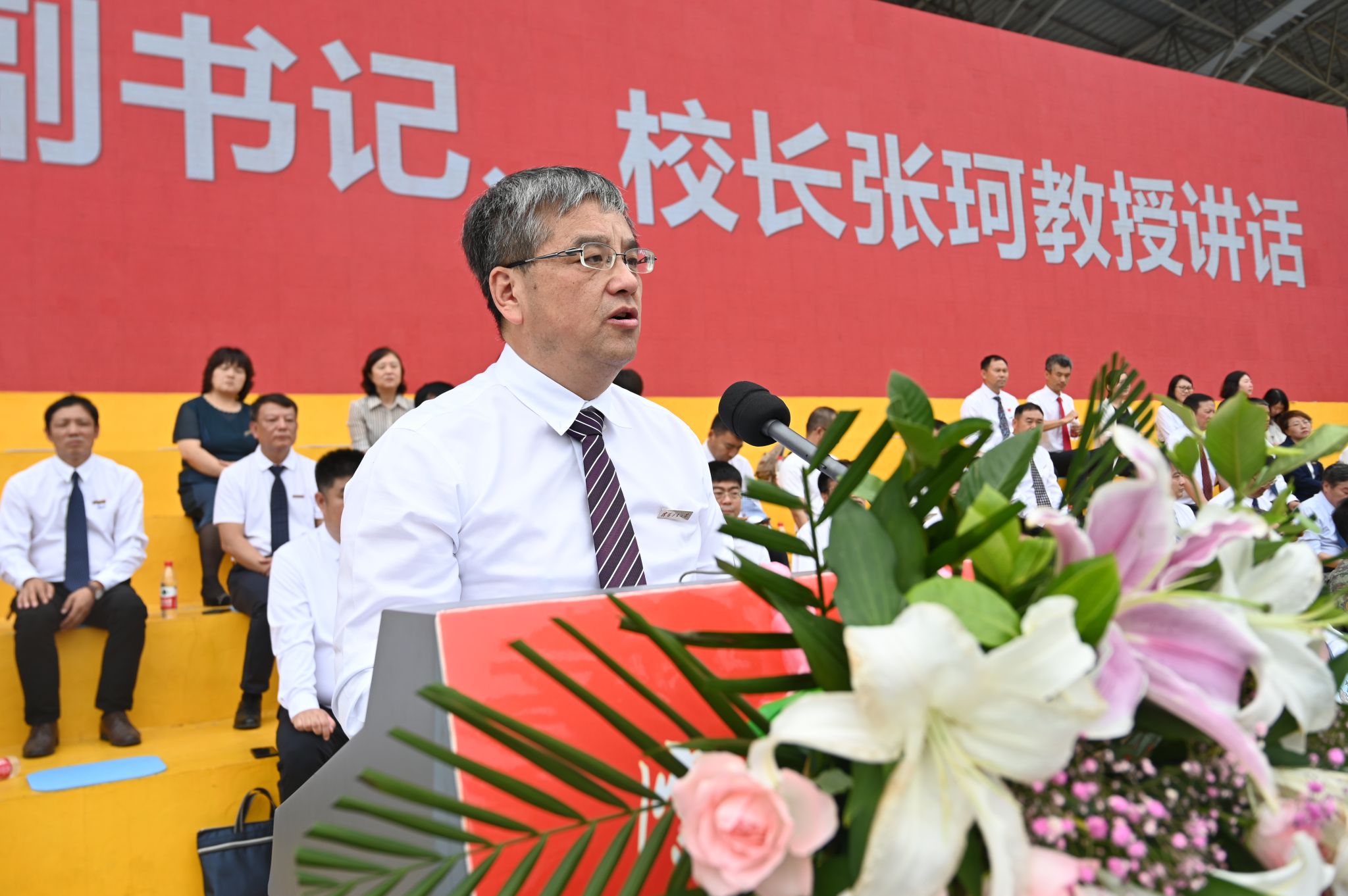 黨委副書記、校長張珂作題為《傳承工大精神 共赴青春之約》的講話,代表學校向2023級新同學表示歡迎和祝賀,為同學們通過軍訓磨礪了意志品質,鍛造了優良作風表示驕傲。他介紹了學校的辦學歷史、文化底蘊和發展成就,希望同學們堅定理想信念,根植工大沃土,厚植家國情懷,勇擔時代使命。
