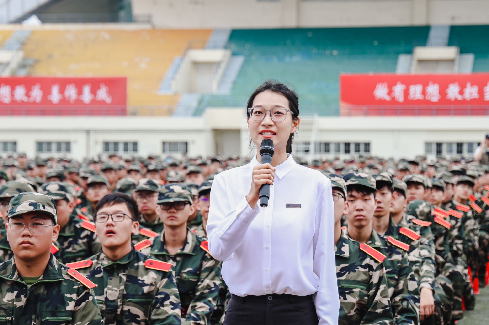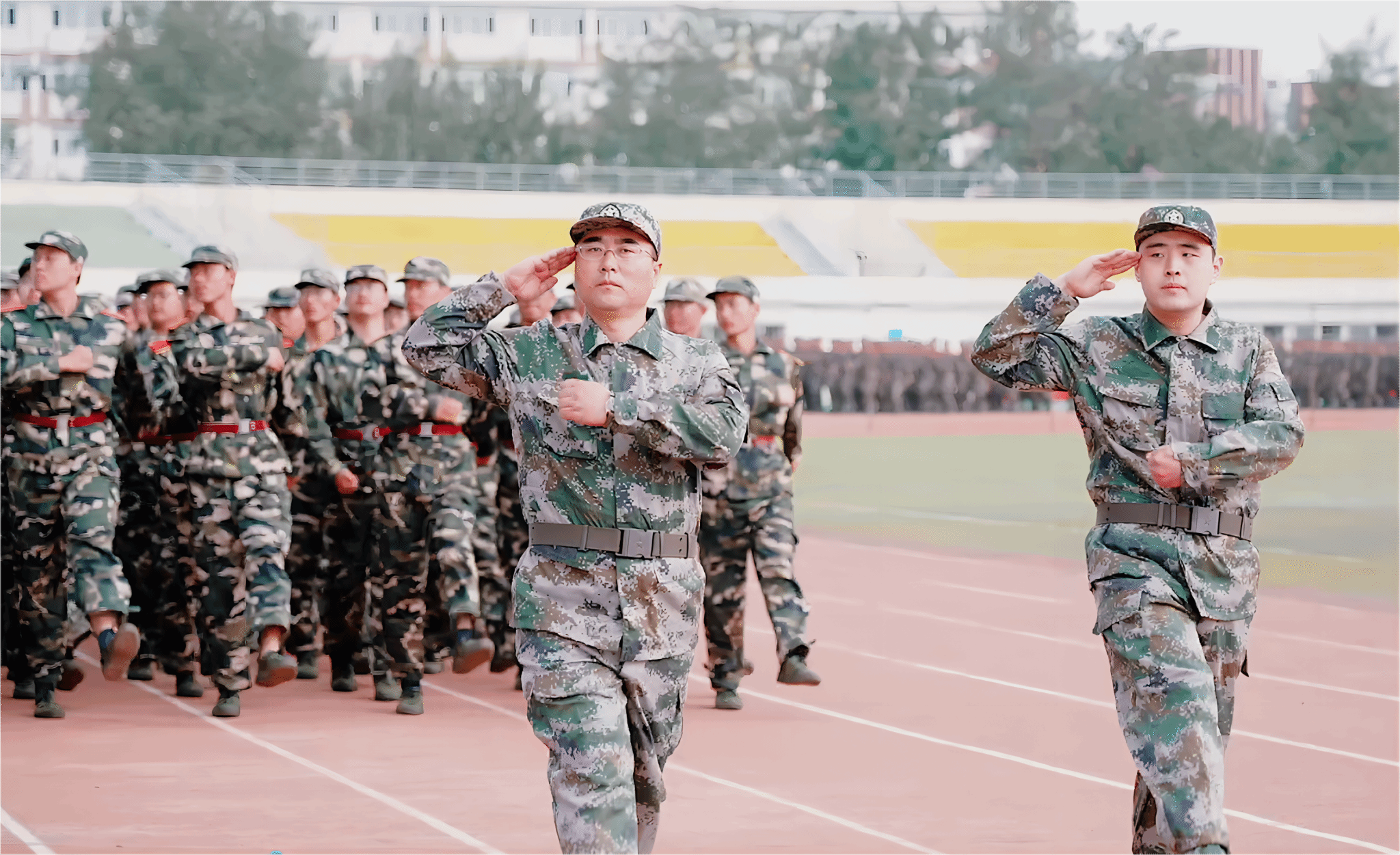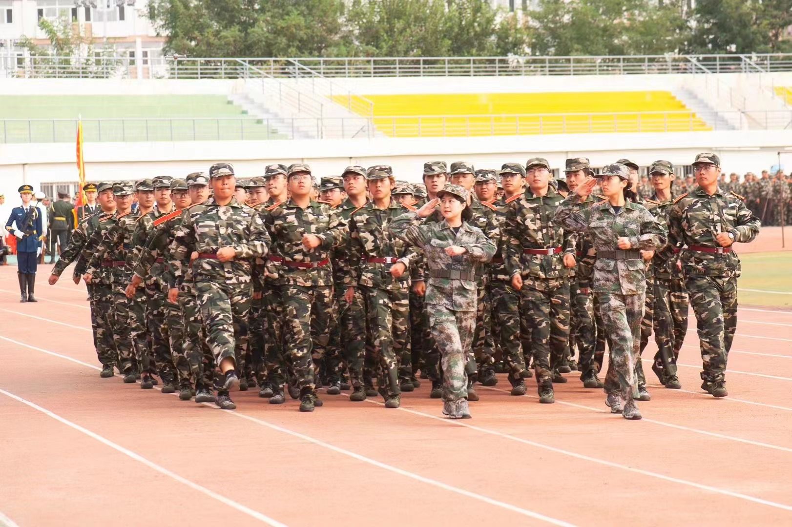 典禮前,進行了軍訓成果匯報。各學院學生工作負責人與新生輔導員擔任分列式領隊,同2023級學生一起步伐整齊、口號嘹亮,精神飽滿地通過主席臺,接受檢閱。