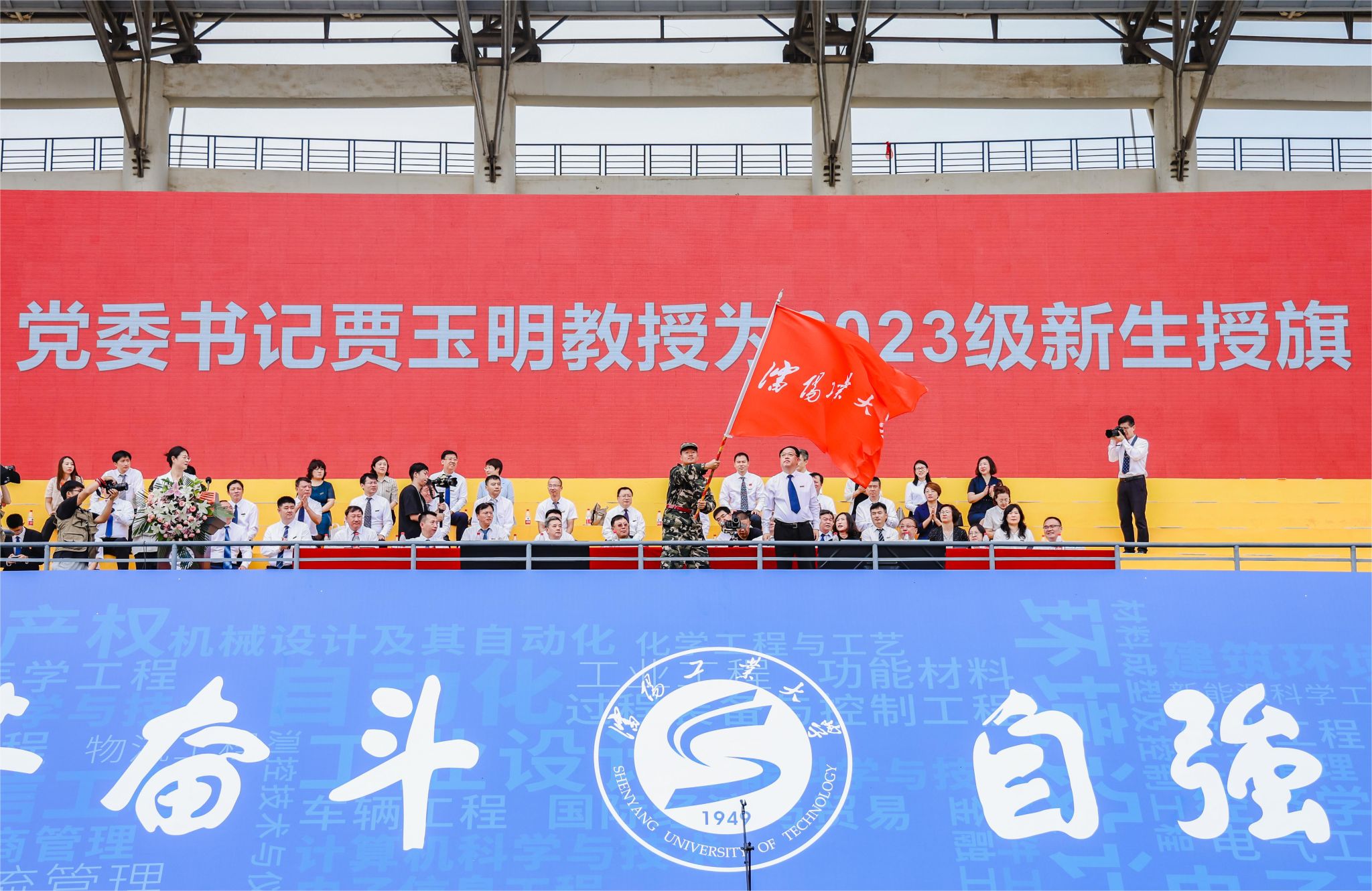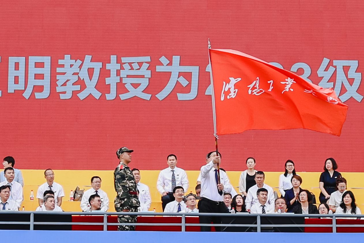 典禮現場,黨委書記賈玉明為2023級新生授旗。接過工大人的接力棒,同學們將繼續傳承工大精神、弘揚工大文化,在強國路上譜寫出絢麗的青春之歌。