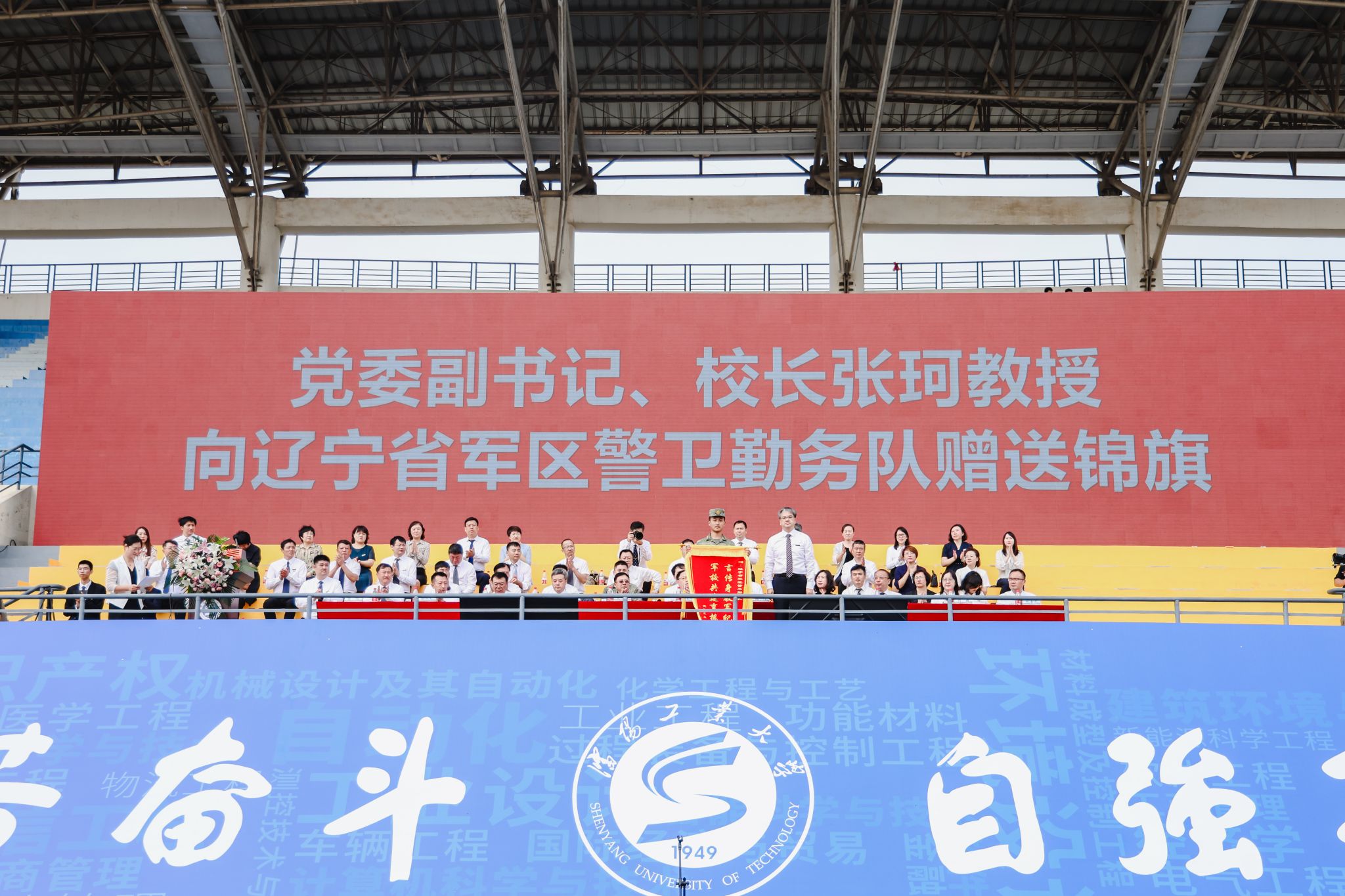 黨委副書記、校長張珂向遼寧省軍區警衛勤務隊贈送錦旗,感謝遼寧省軍區教官對學生軍訓工作的悉心指導。