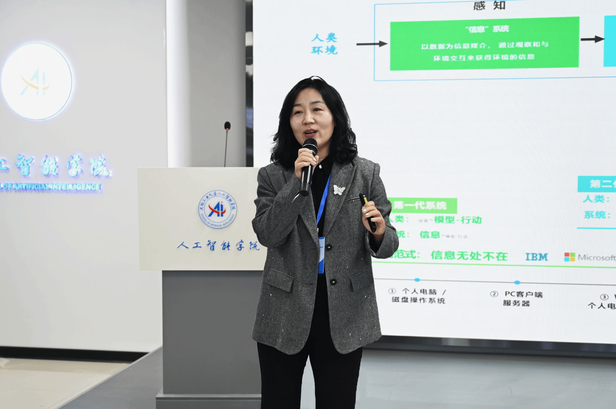 研討會上,人工智能學院張曉玲教授先以“人工智能的前世今生——DeepSeek時代教育的永恒價值”為題,系統梳理了人工智能大模型的來龍去脈,通過對比分析目前熱點大模型技術,指出我國自主研發的DeepSeek模型通過算法創新、開源共享等打破算力壟斷,逐漸從大模型競賽轉向效率革命,推動AI技術普及和發展加速。此外,張曉玲教授以教育教學過程中豐富生動的應用實例和詳實量化的數據,引導師生理解人工智能大模型對教育教學的深刻影響,挖掘人工智能時代教育的永恒價值點。